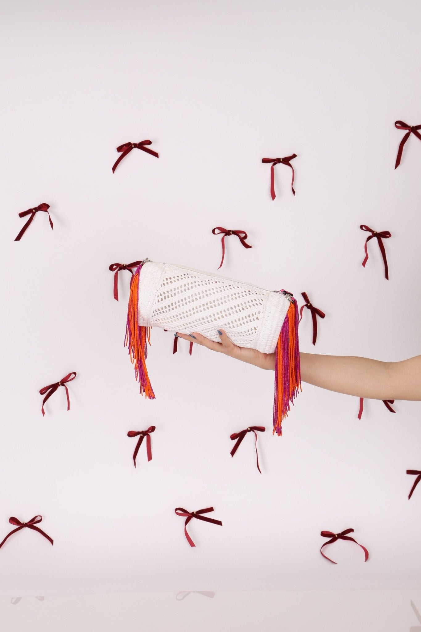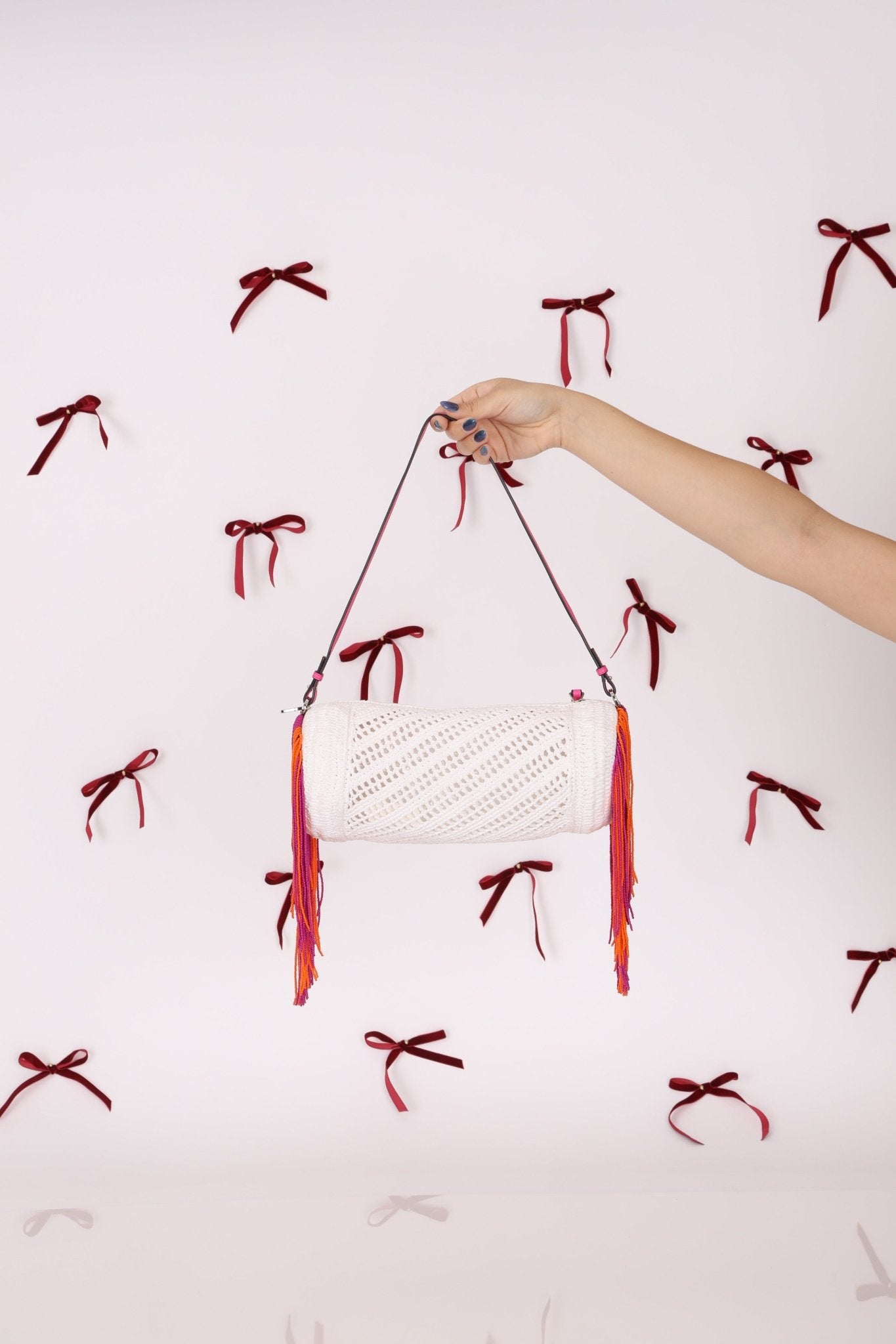 Nica’s obsession with the Loewe Bracelet Pouch continues—and it’s only fitting she included a rare gem in today’s drop. This standout piece from the 2002 collection features a crisp white crocheted body, finished with vibrant fuchsia and orange fringe. Equal parts playful and chic, it’s the perfect summer statement.