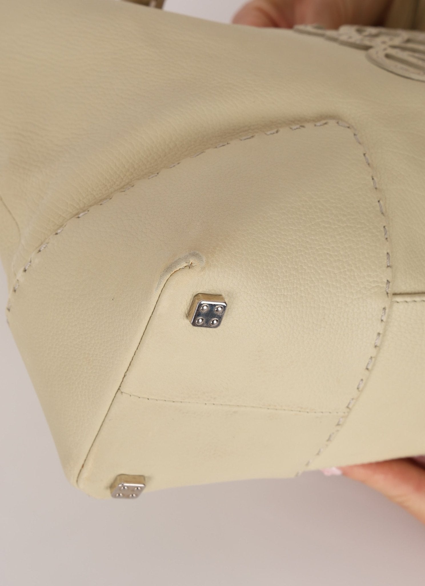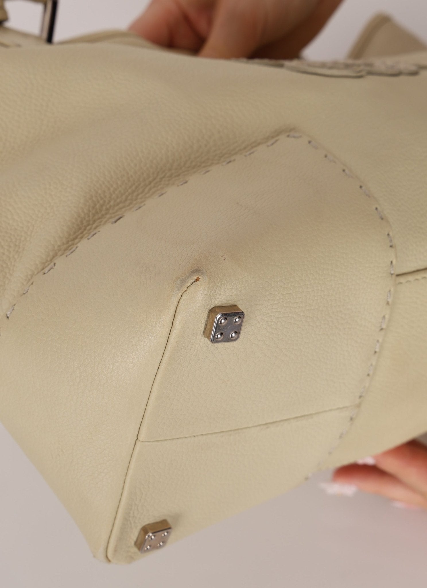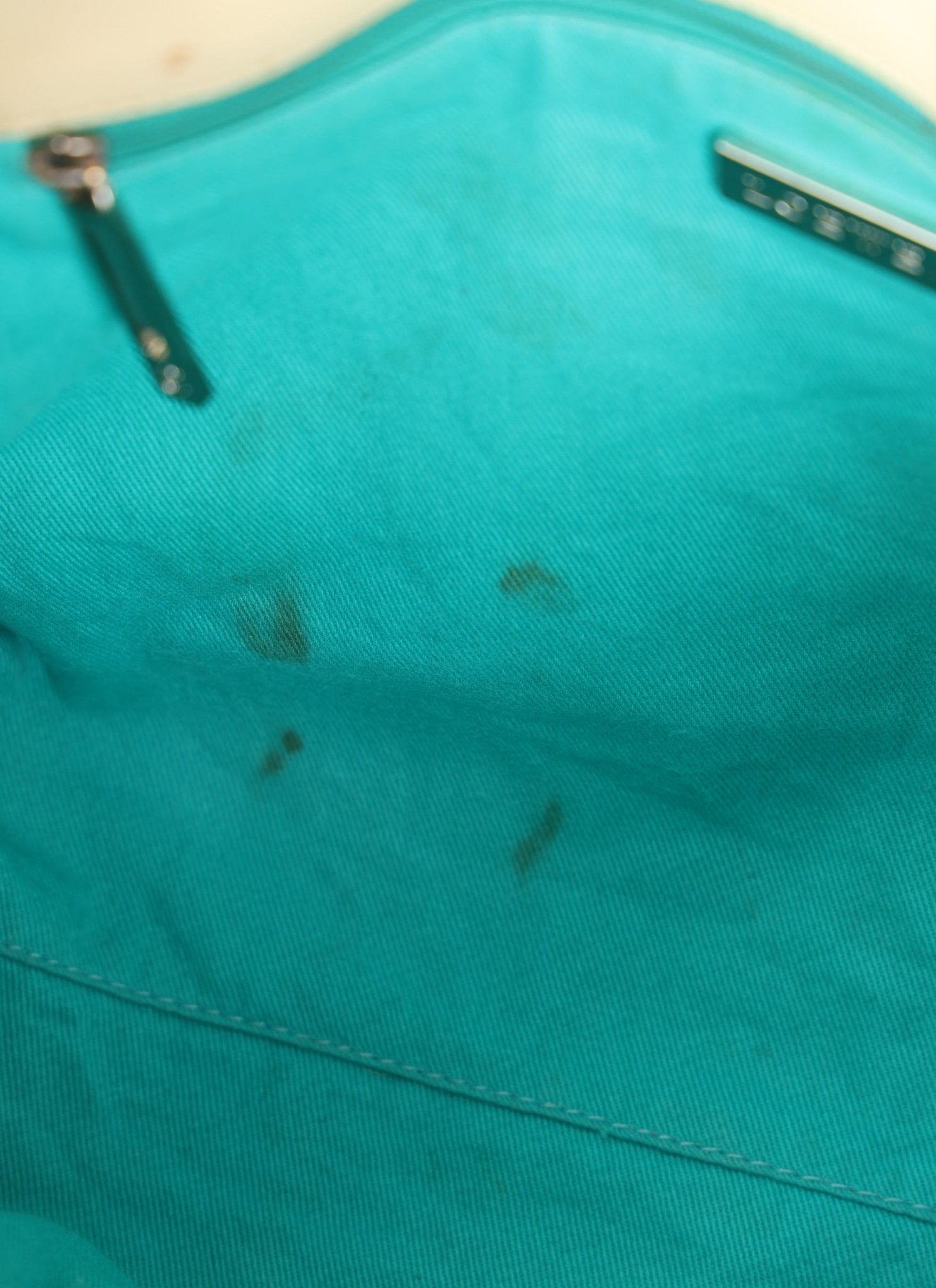 Hairline scratches on hardware. Corner rubs. Color transfer under handles. Stains in interior.