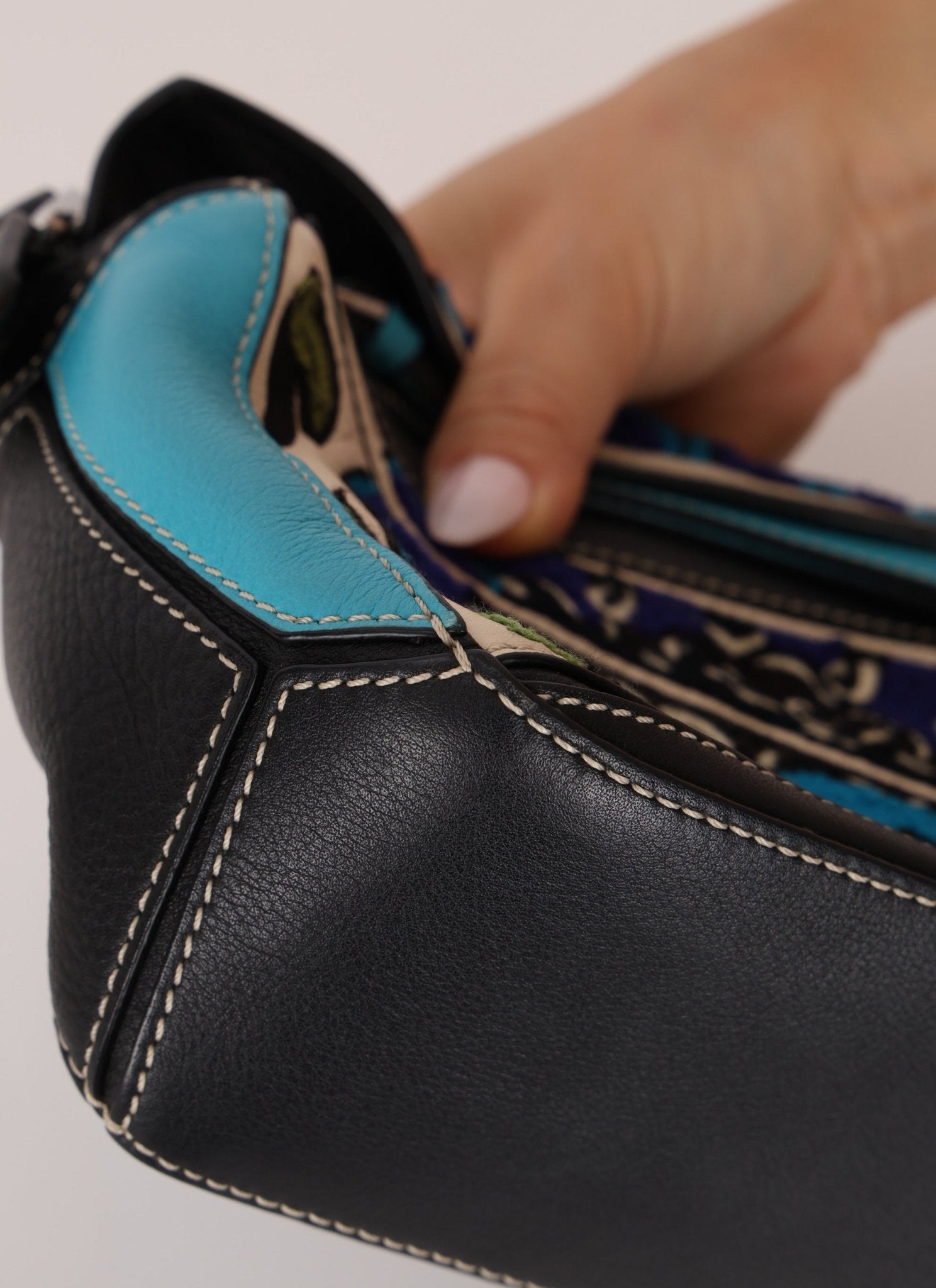 This Limited Edition Loewe Embroidered Floral Mini Puzzle Bag reimagines the brand's iconic geometric design by Jonathan Anderson, and reimagined by British artist William De Morgan's whimiscal floral influence. Its artisanal craftsmanship and versatile silhouette make it a stunning accessory for those who appreciate both style and practicability.