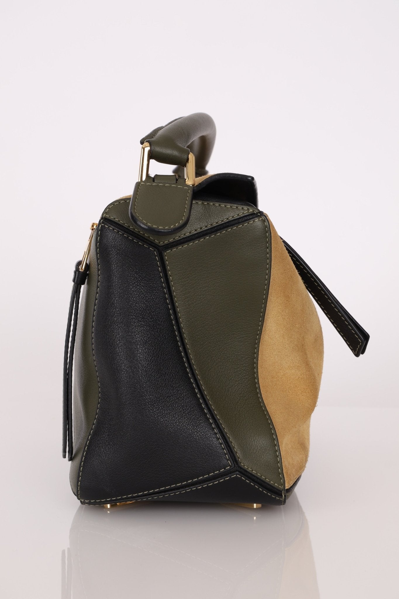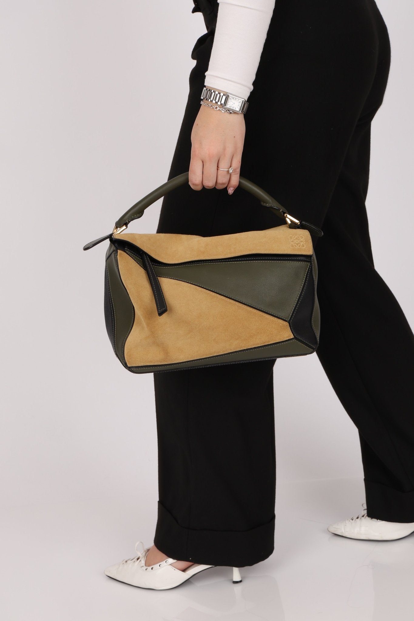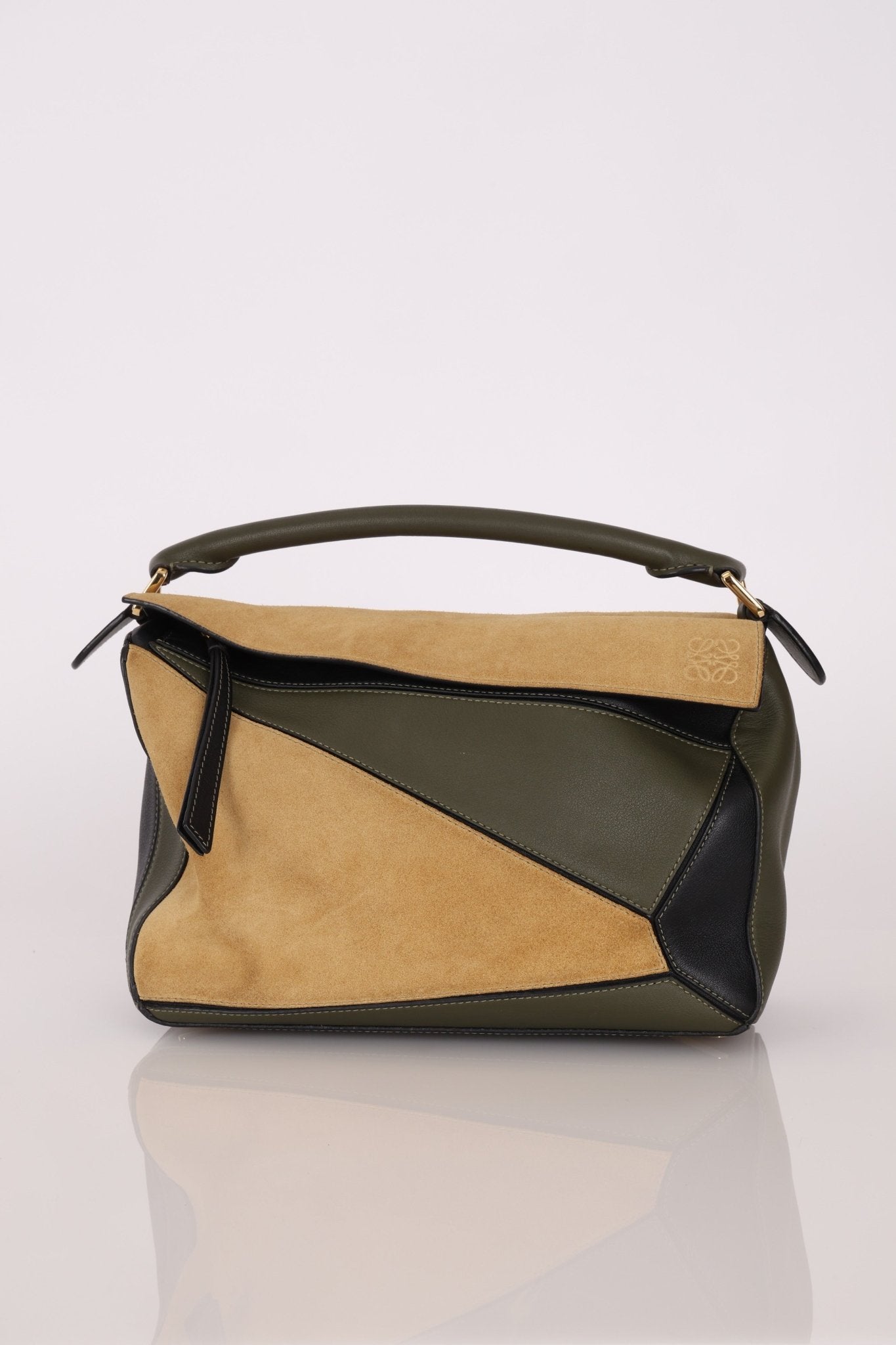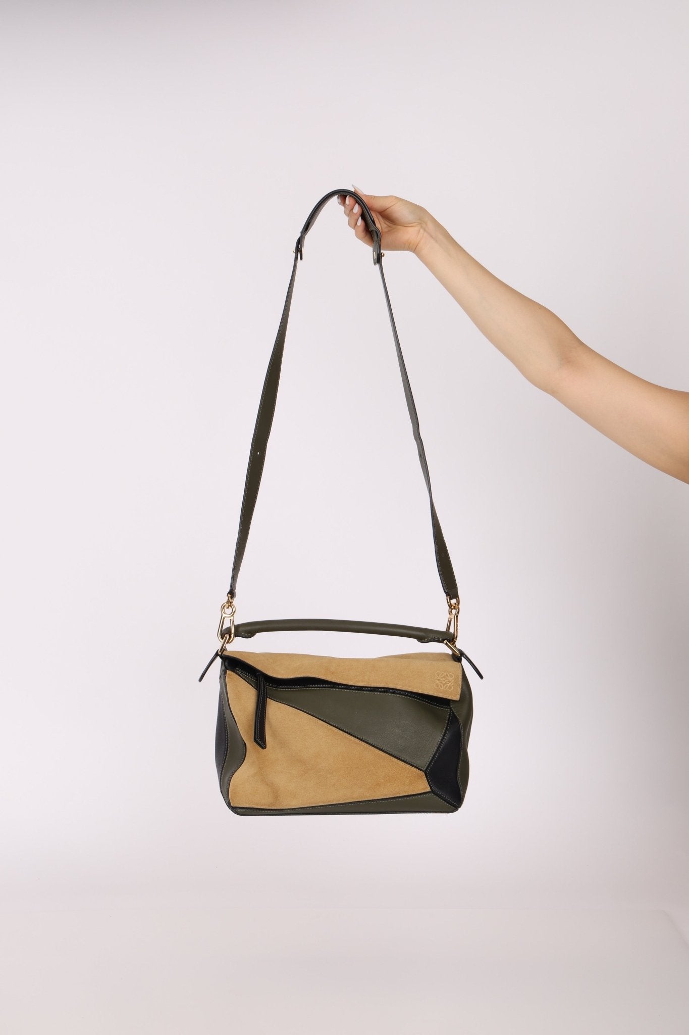 Loewe Suede & Olive Medium Puzzle Bag - FashioNica