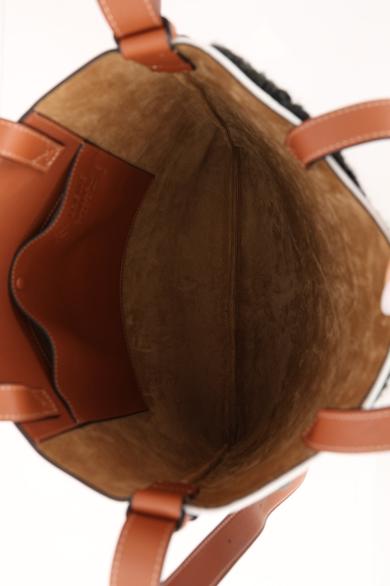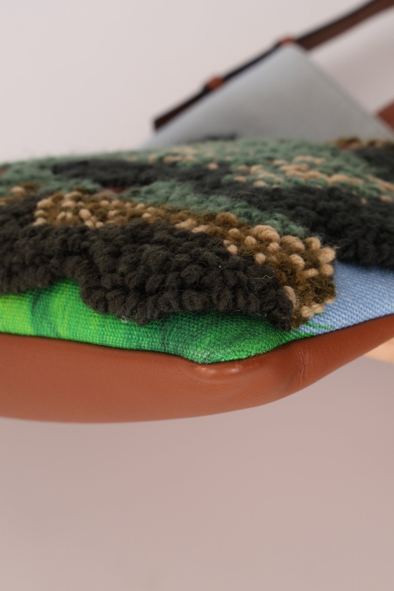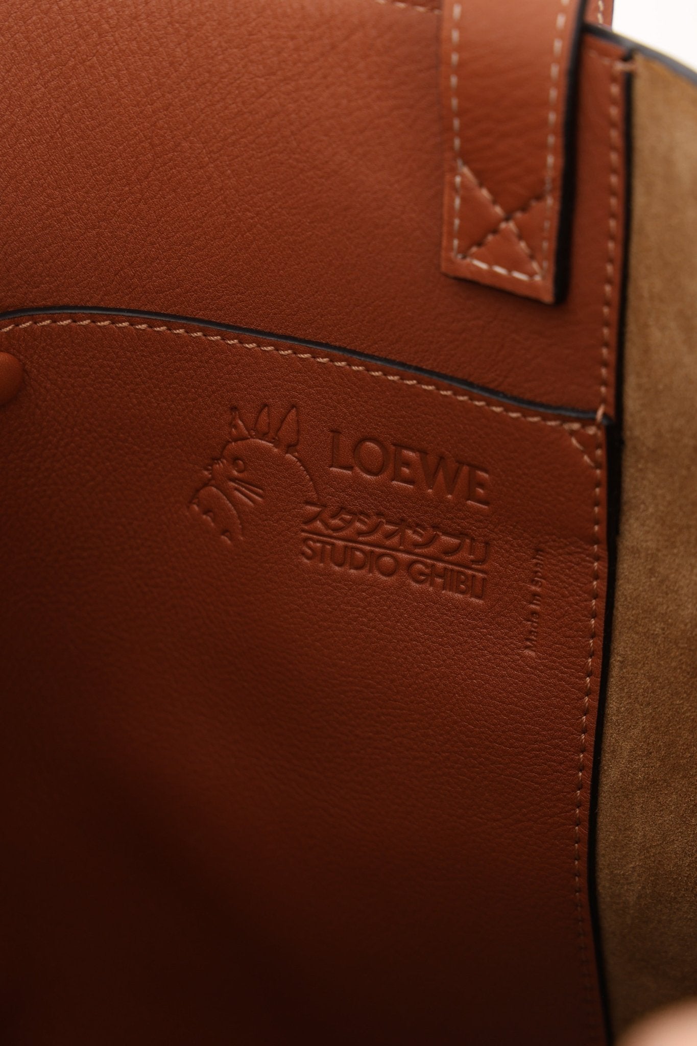 Loewe teamed up with "My Neighbor Totoro" to create a special capsule collection in 2021 centered on the famous film. This vertical tote highlights a knitted sweeping landscape backdrop with Totoro himself that evokes heartwarming feelings and solace that Jonathan Anderson aimed to accomplish with this capsule collection.