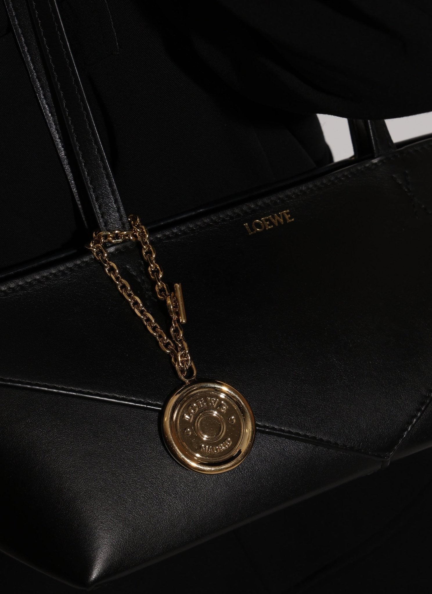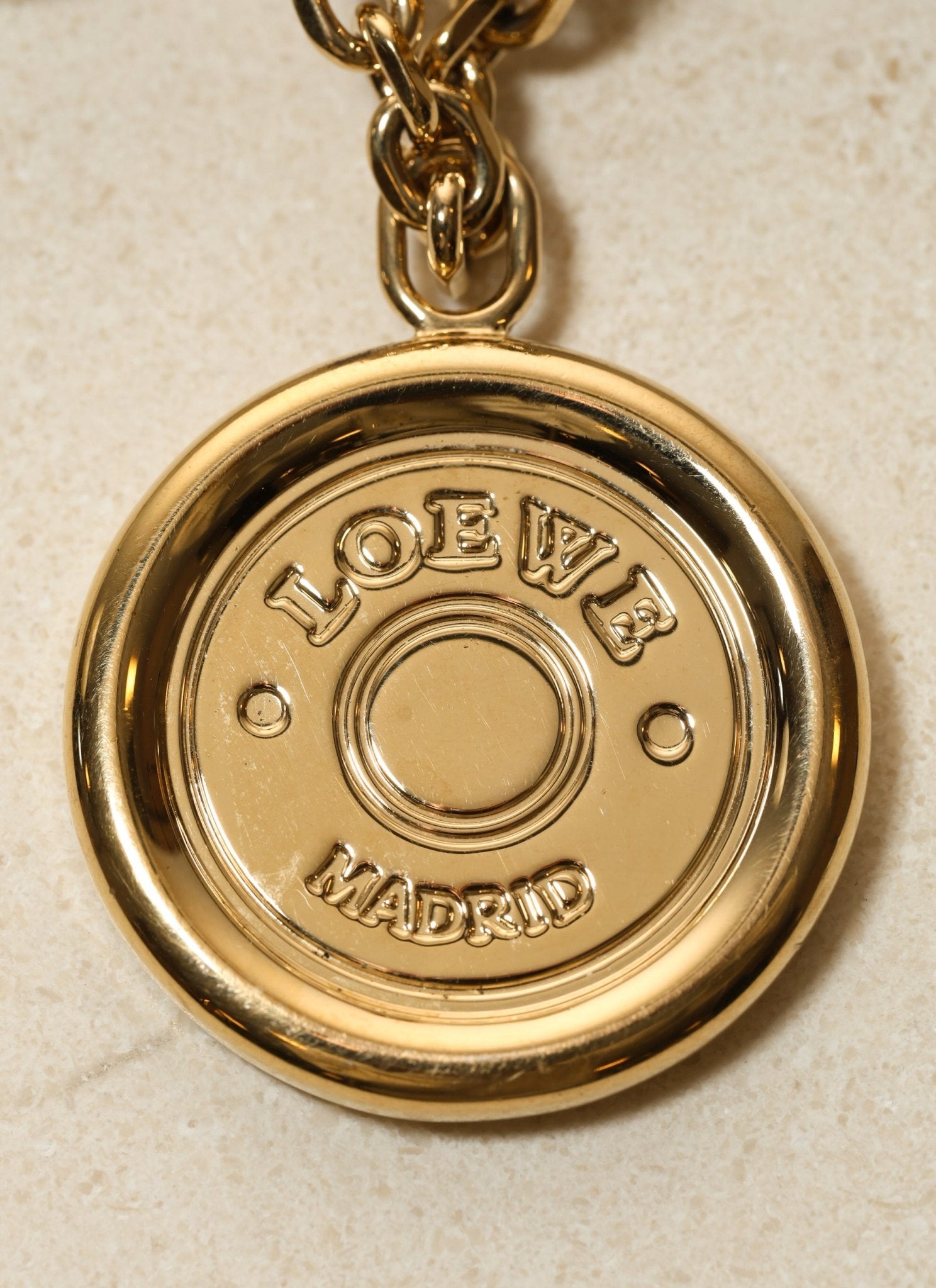 This sleek Loewe Bag Charm evokes a wax seal image in shiny gold tone hardware. Loop onto your bag or even string your keys onto the chain!