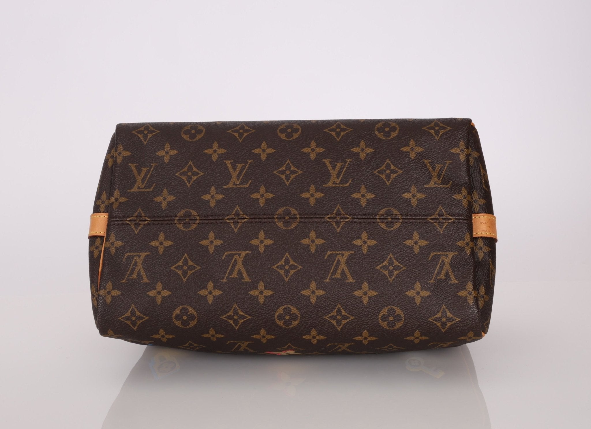 Hairline scratches on hardware. Honey patina to vachetta. Tiny peel on corner of the flower with the gold foil (pictured).
