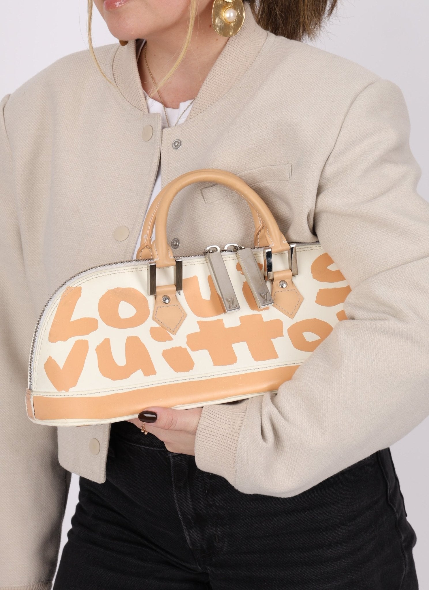 Dropping in the shop is a fun graffiti Louis Vuitton x Stephen Sprouse Vernis Long Alma in white with pops of peach and silver hardware! This unique piece is such a great everyday bag for the neutral colors and spacious interior. The long, east-west shape and the Stephen Sprouse collaboration makes this piece so special!