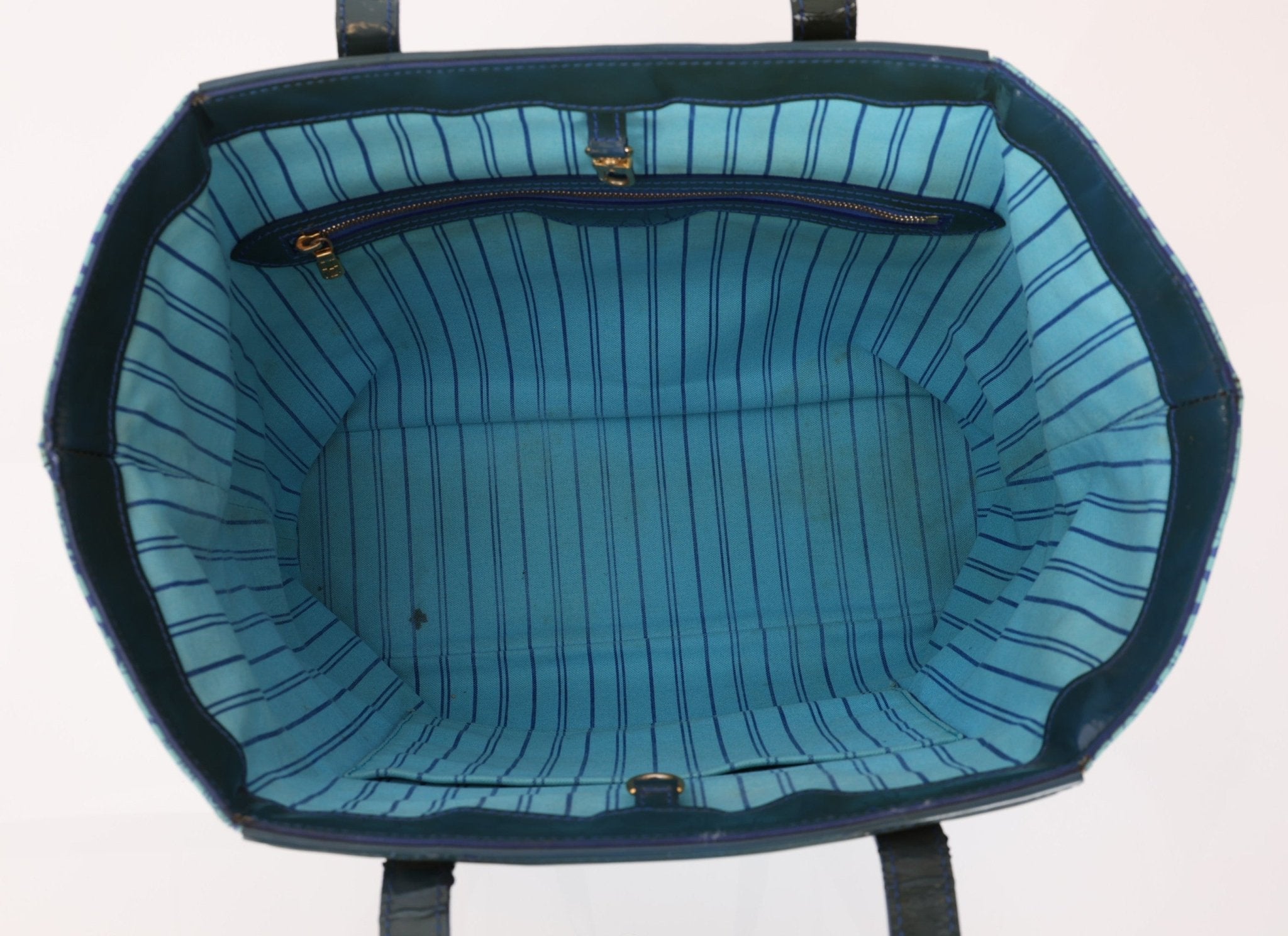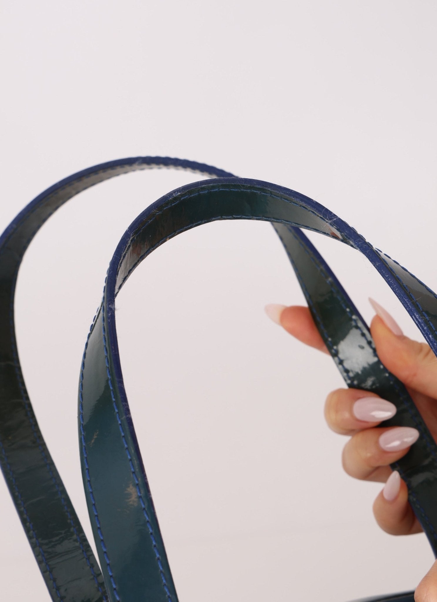 Hairline scratches and tarnishing on hardware. Normal wear throughout patent. Corner rubs. Small mark on bottom exterior. Small mark on interior.