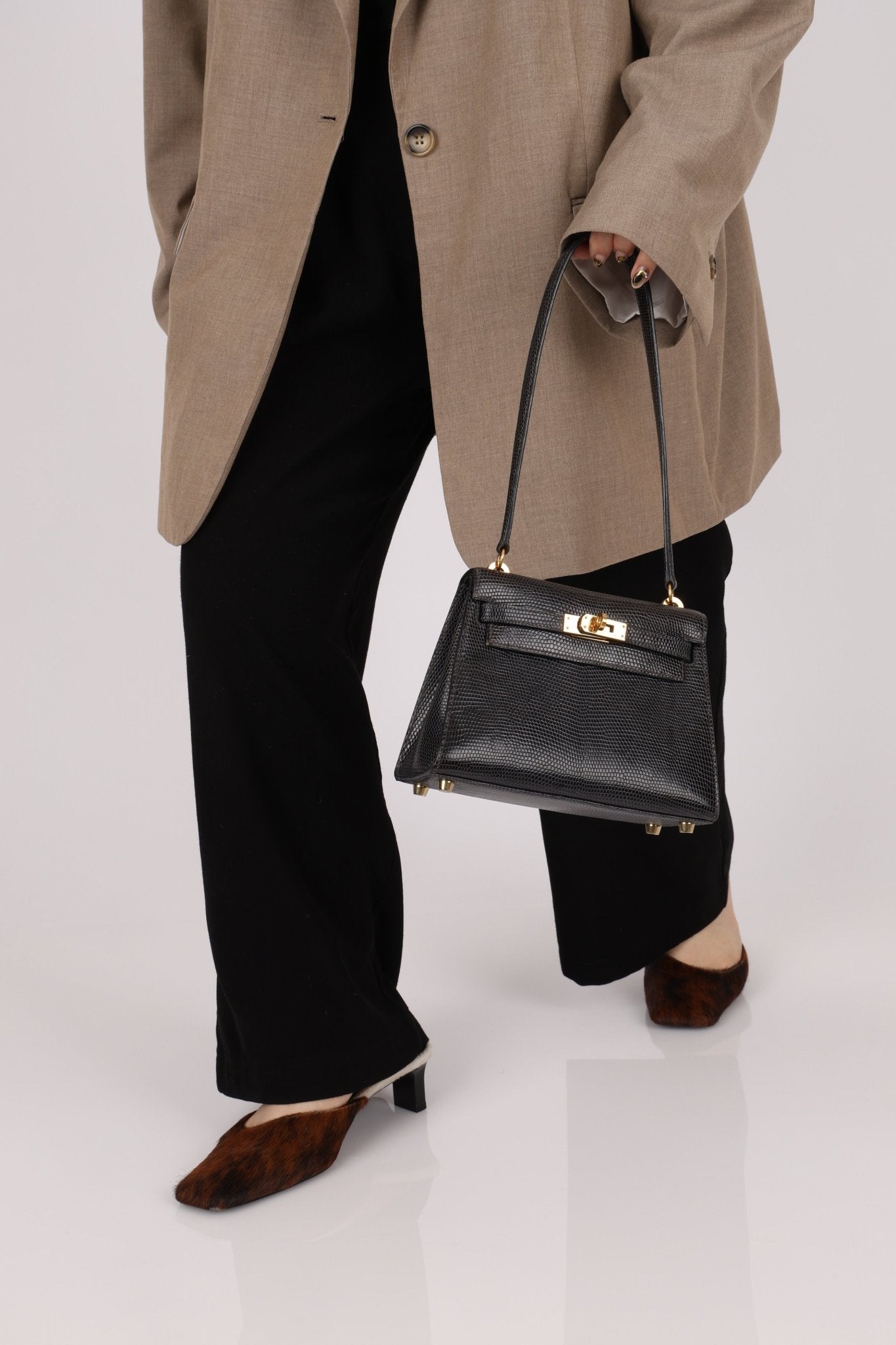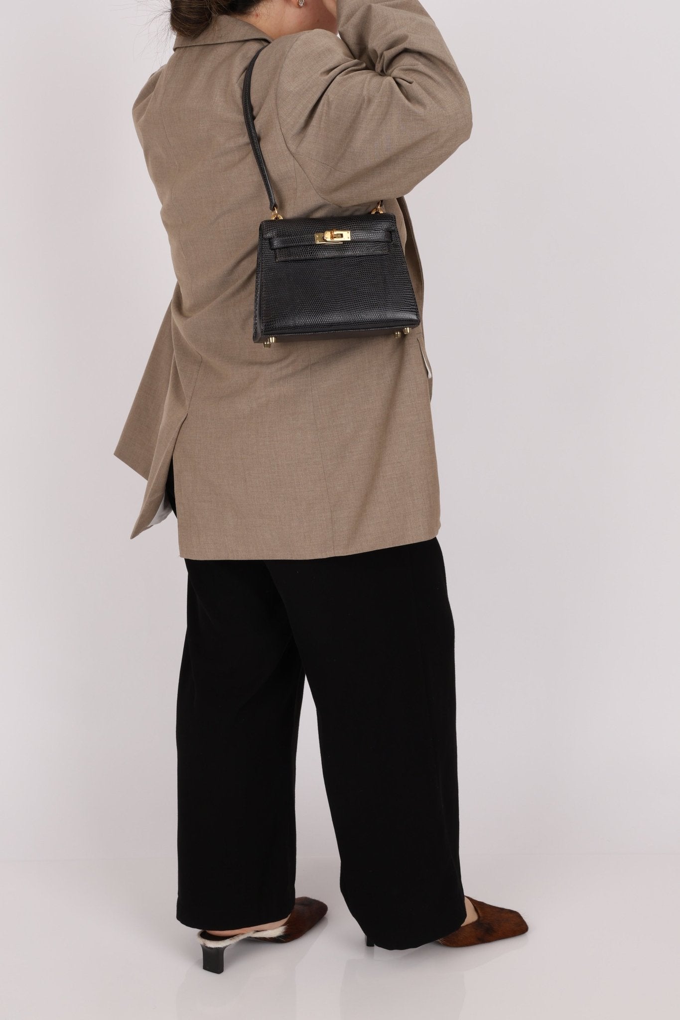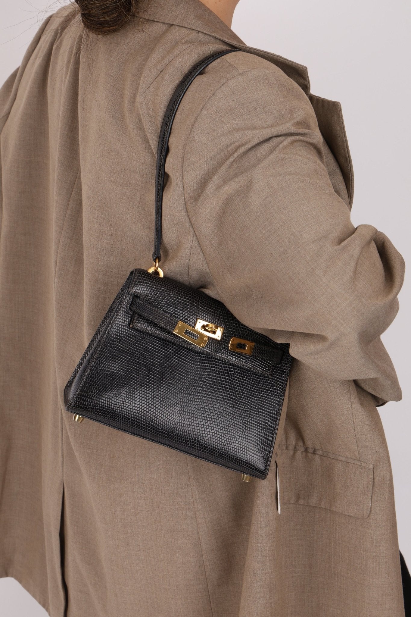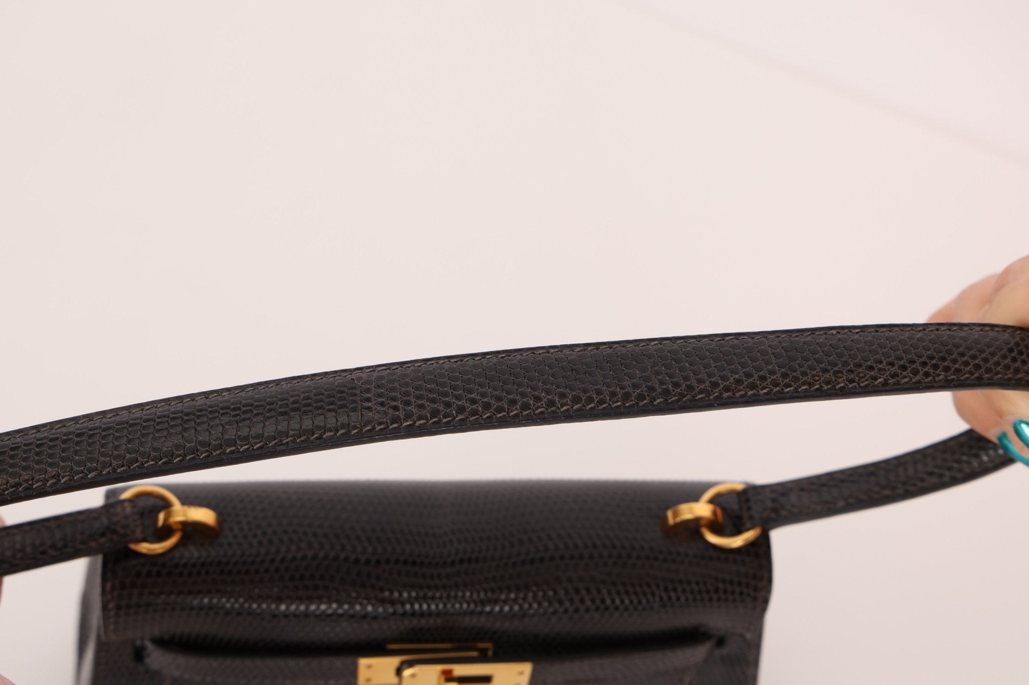 Twin with Nica! Offering in Community Curation a RARE Mini Kelly crafted from stunning lizard leather and 18K GP hardware. The first iteration of the contemporary Mini Kelly, this shoulder edition features a sleeker silhouette and elongated strap design, making it both a collectible masterpiece and a functional treasure. Nica just recently added this bag into her collection here!