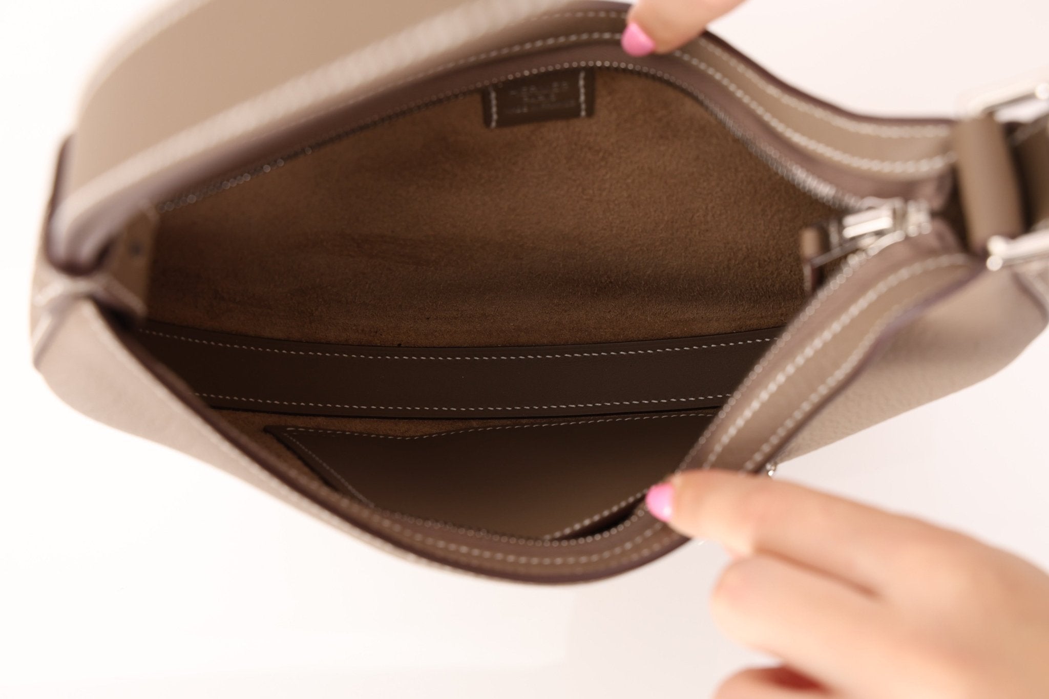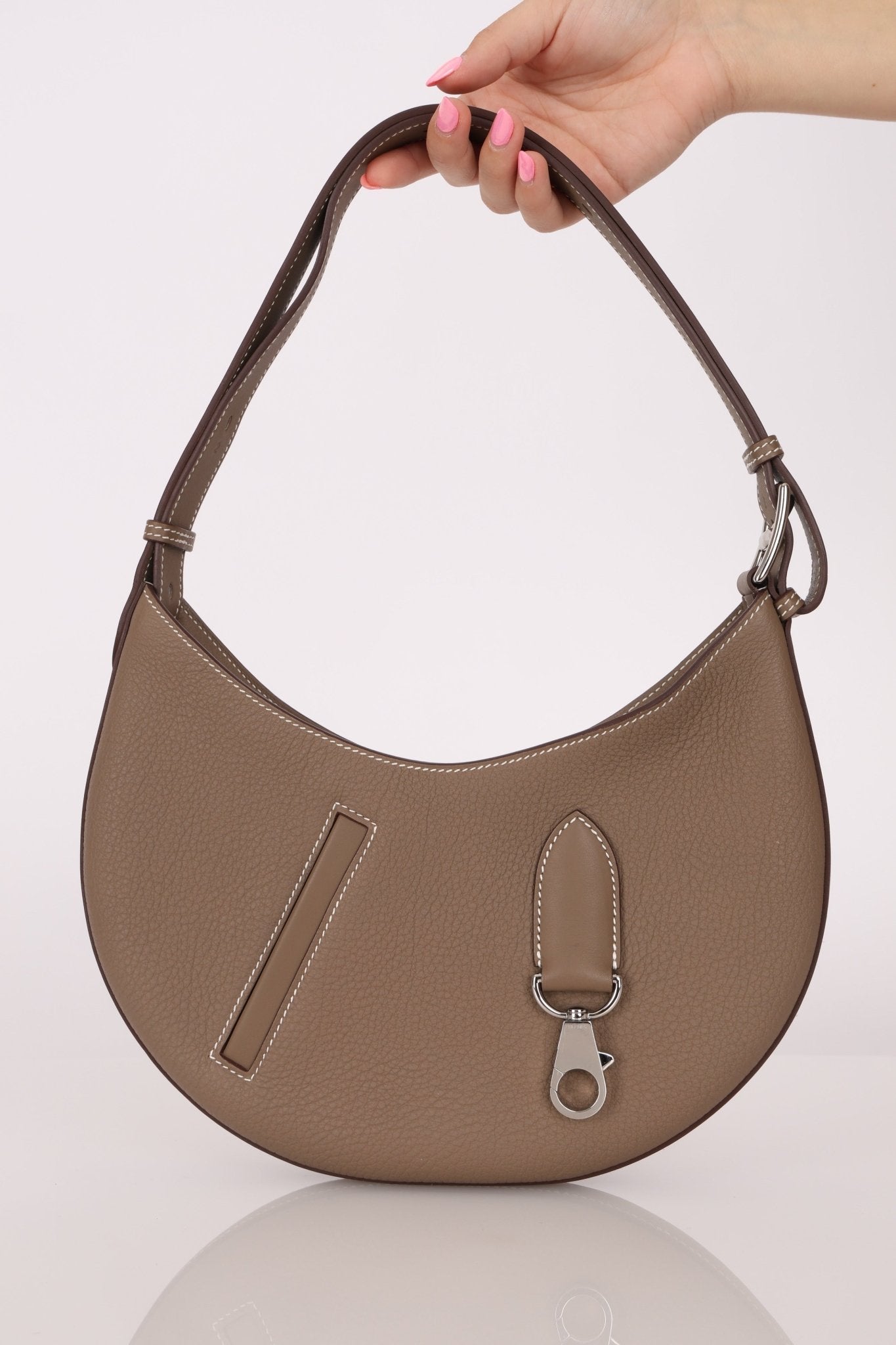 The Hermès Etoupe Togo P’tit Arçon blends sporty elegance with classic Hermès craftsmanship, featuring supple Togo leather in the versatile taupe-grey Etoupe shade and the bag’s signature curved saddle-inspired shape. Wear it crossbody for a polished, hands-free city look, sling it casually over the shoulder for weekend strolls, or carry it by the short strap to give your outfit an equestrian-chic twist.