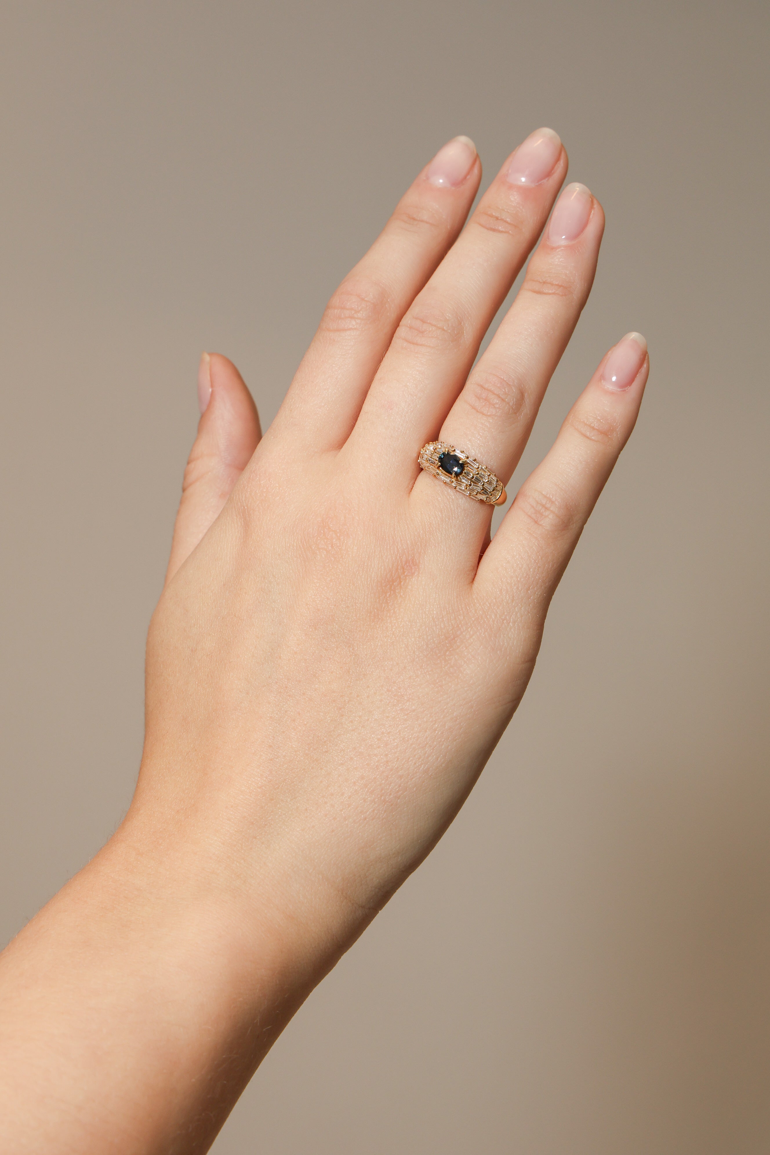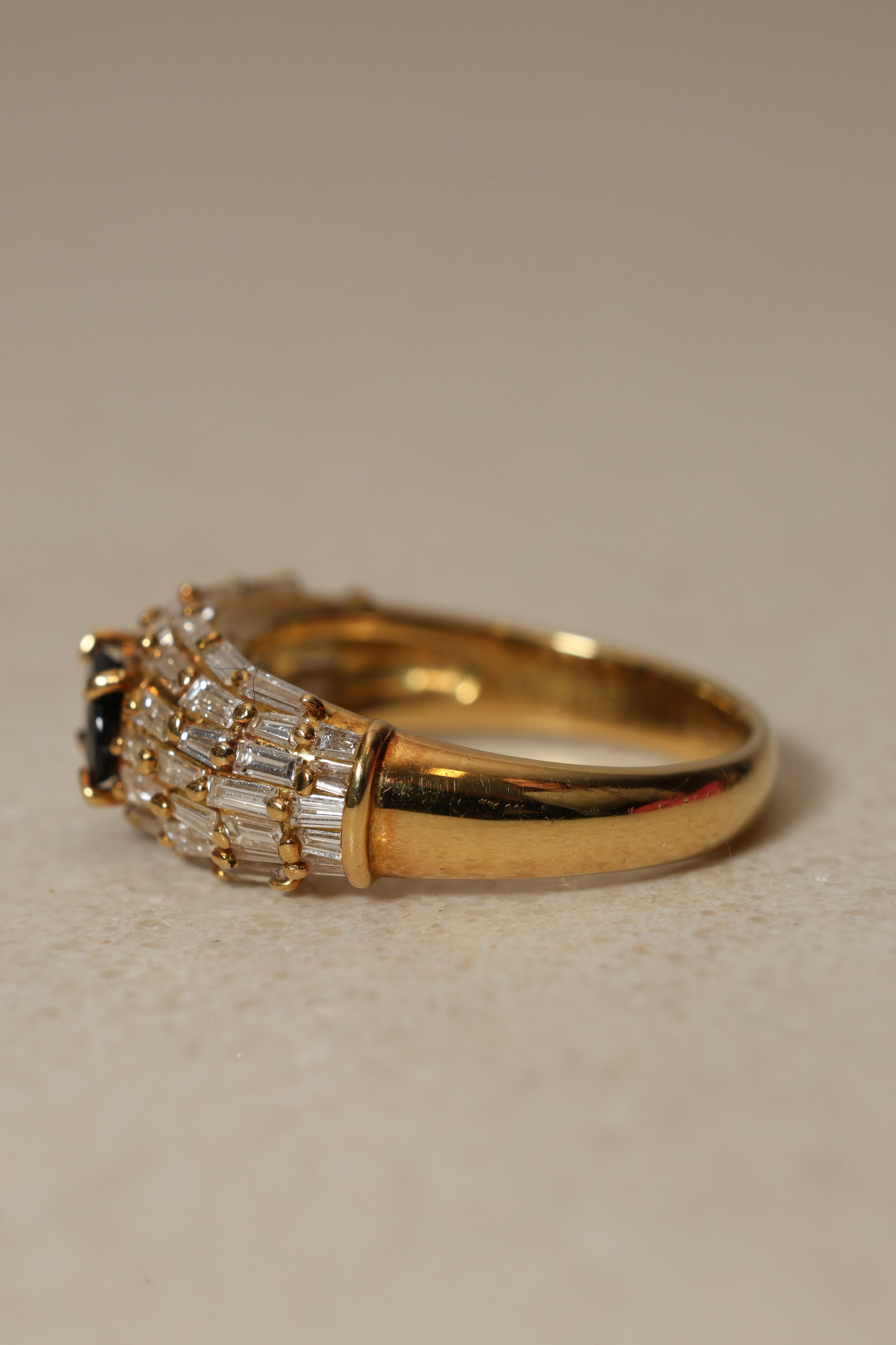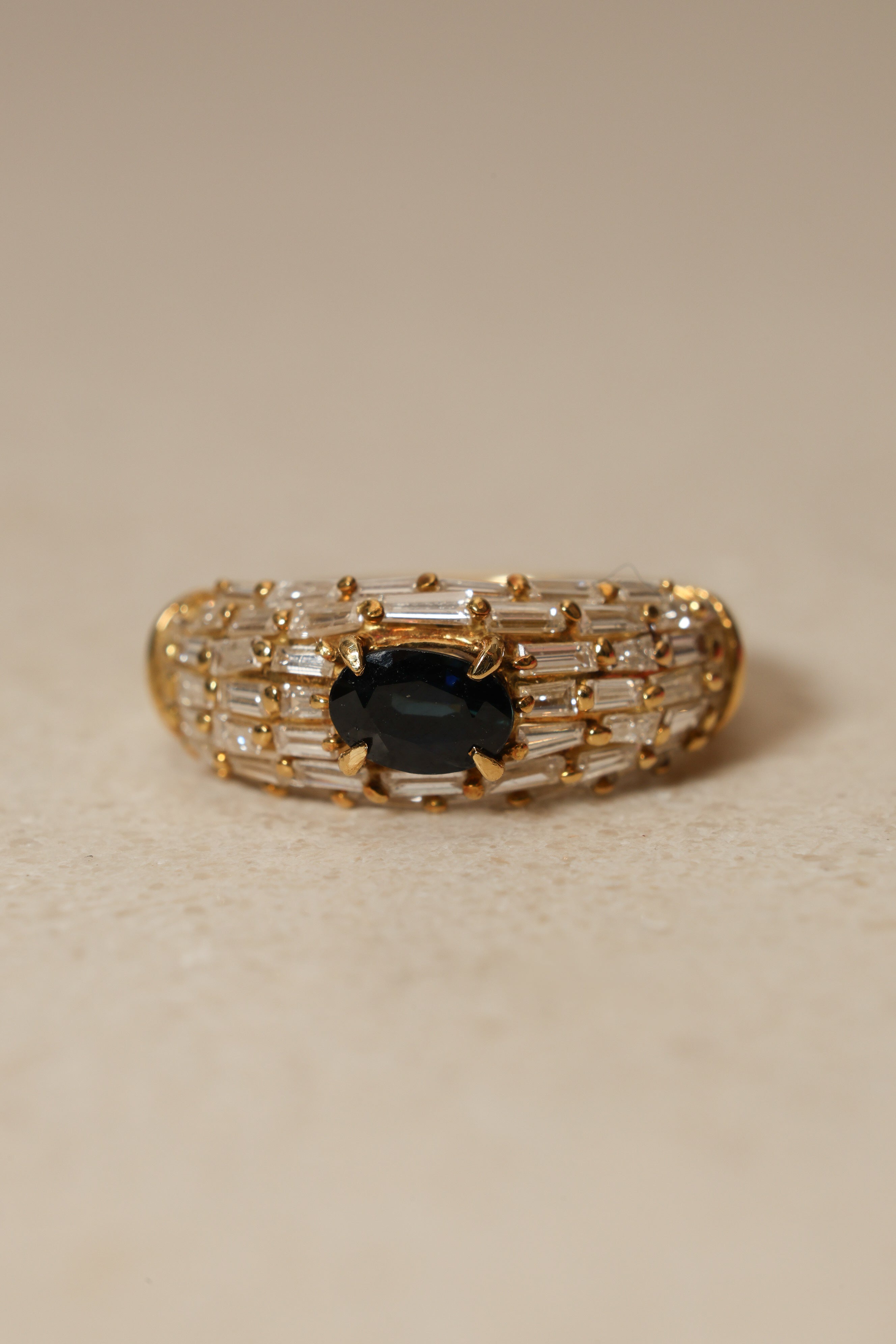 Maximizing impact and creativity, cluster rings are cemented as some of the most unique pieces of fine jewelry on the market. This version has over 50 baguette diamonds all surrounding a gleaming center sapphire.