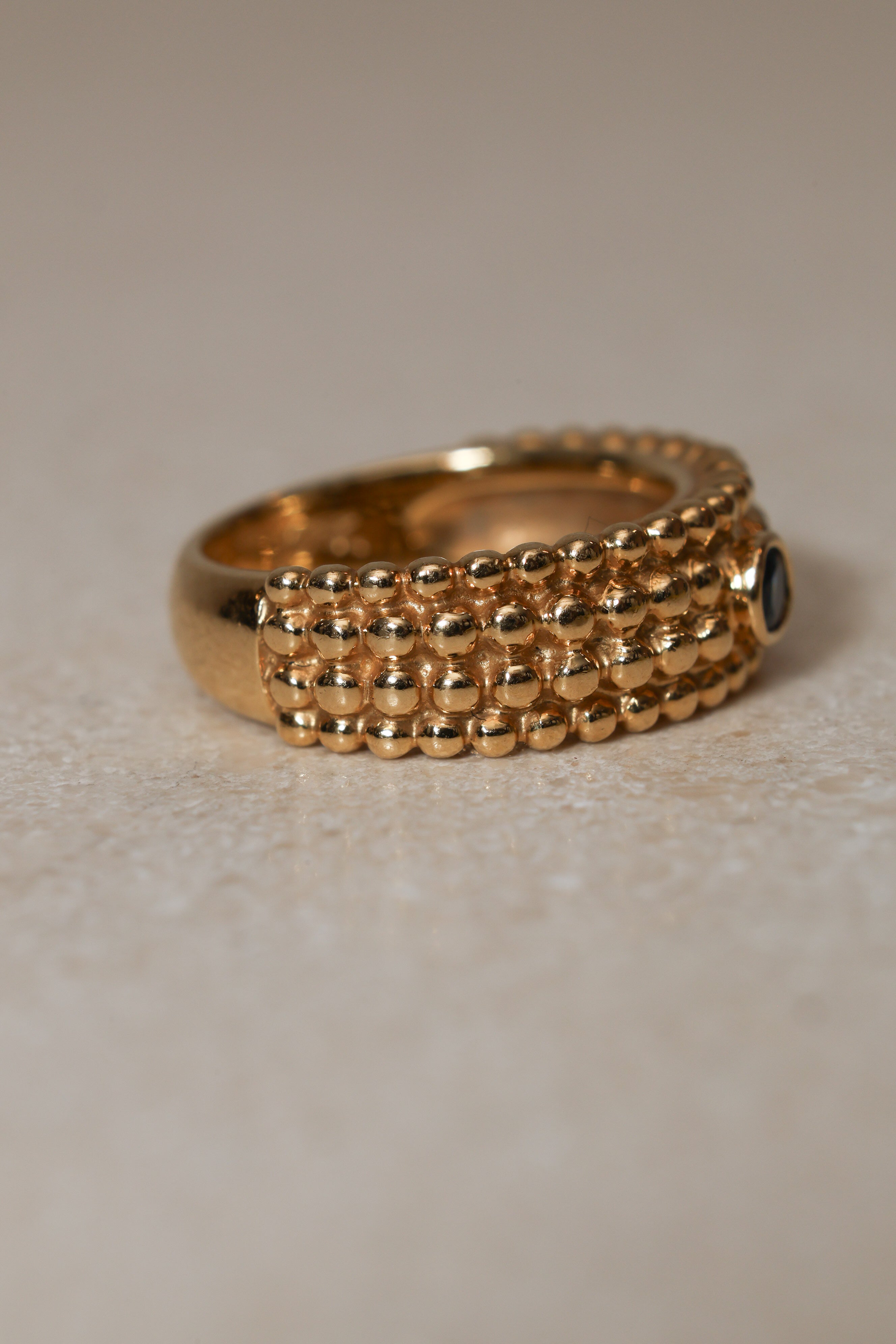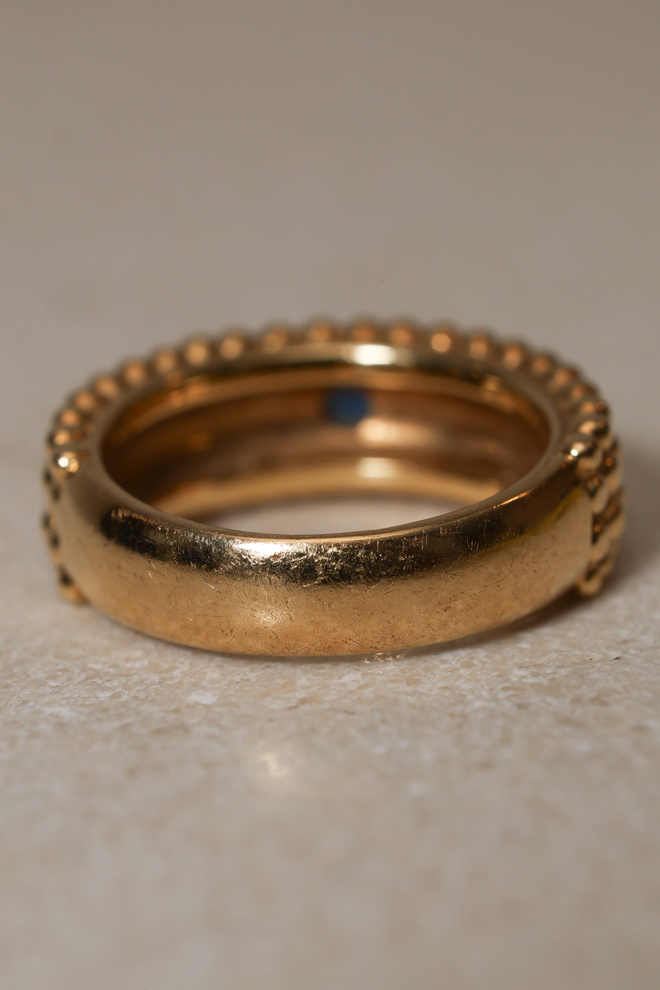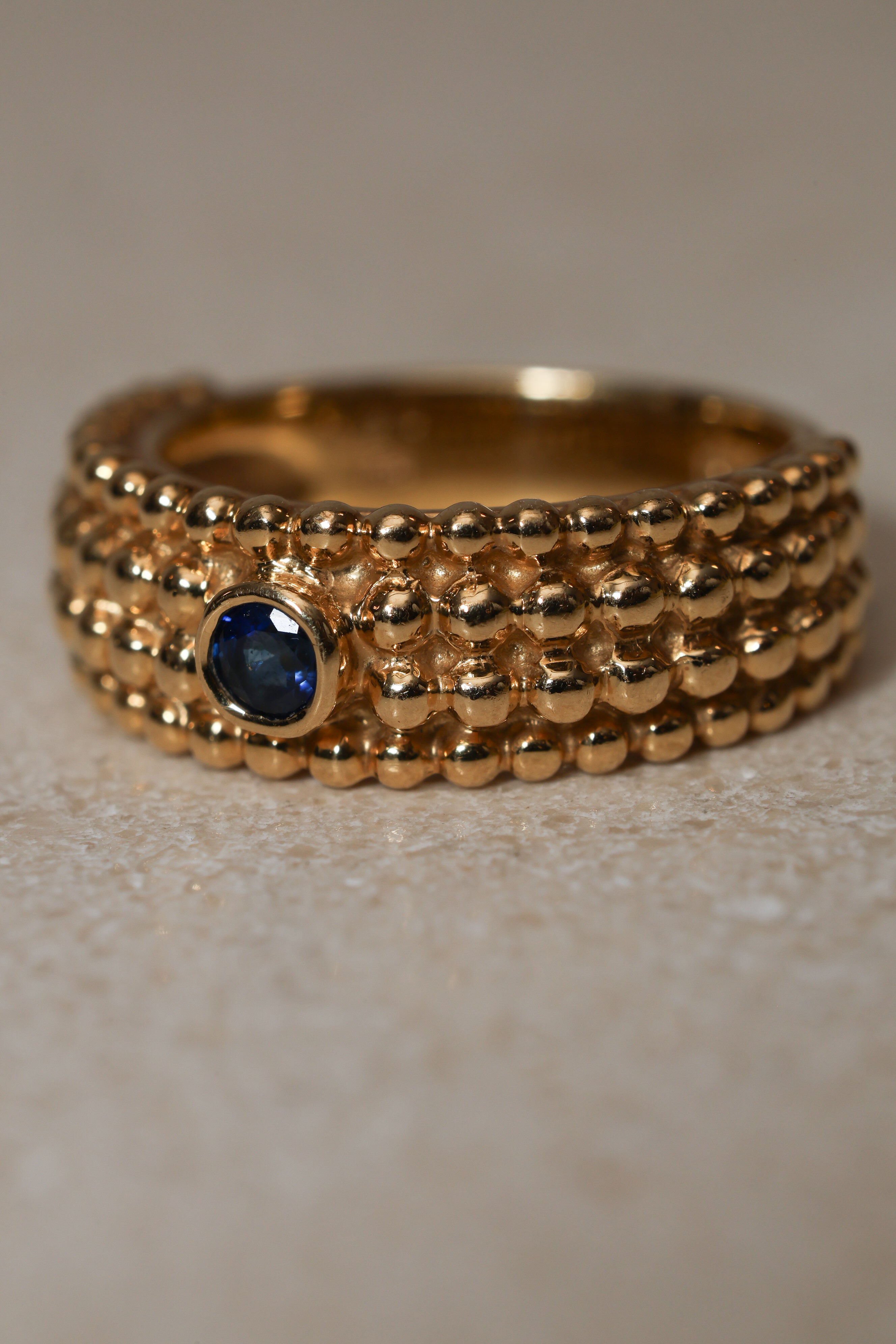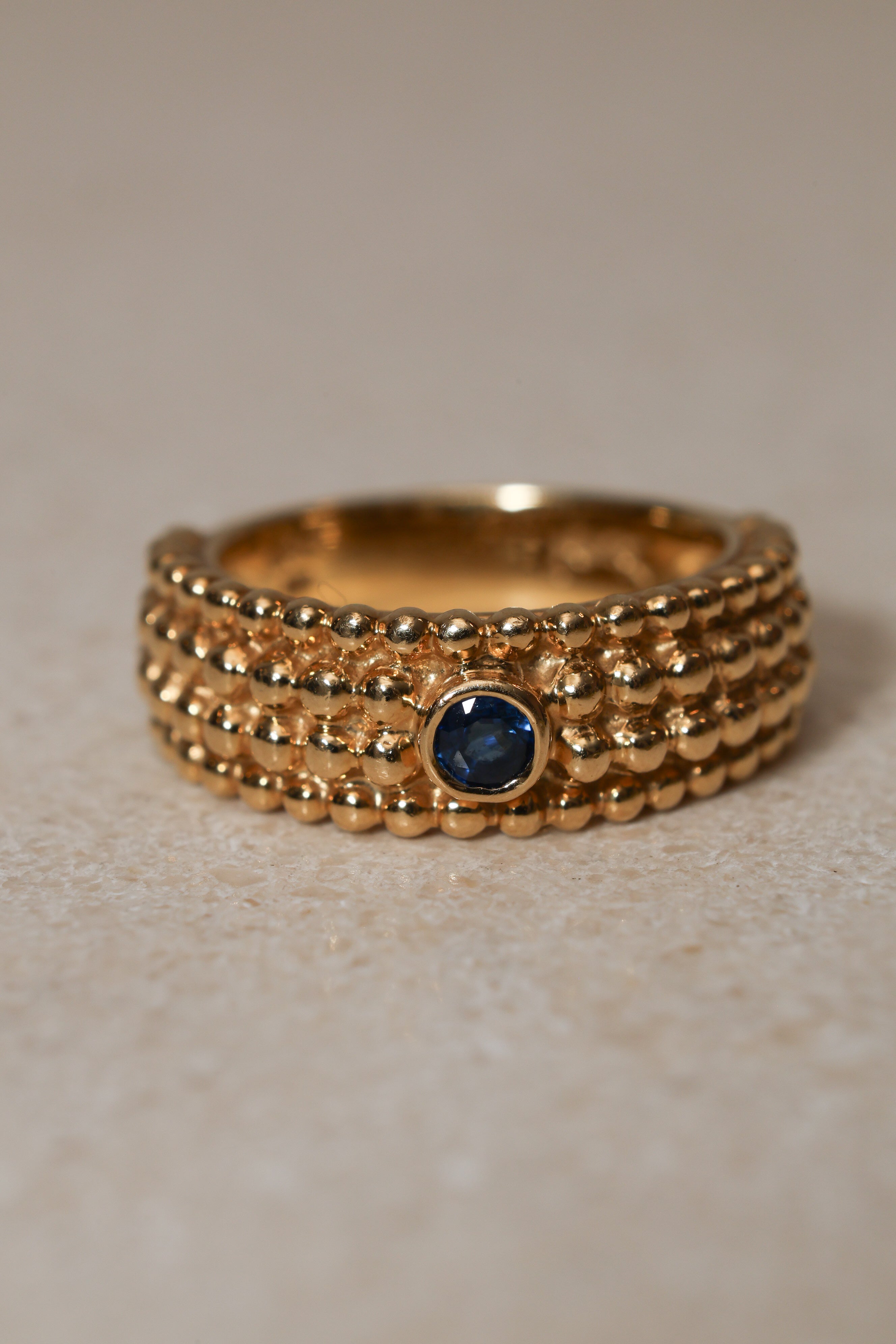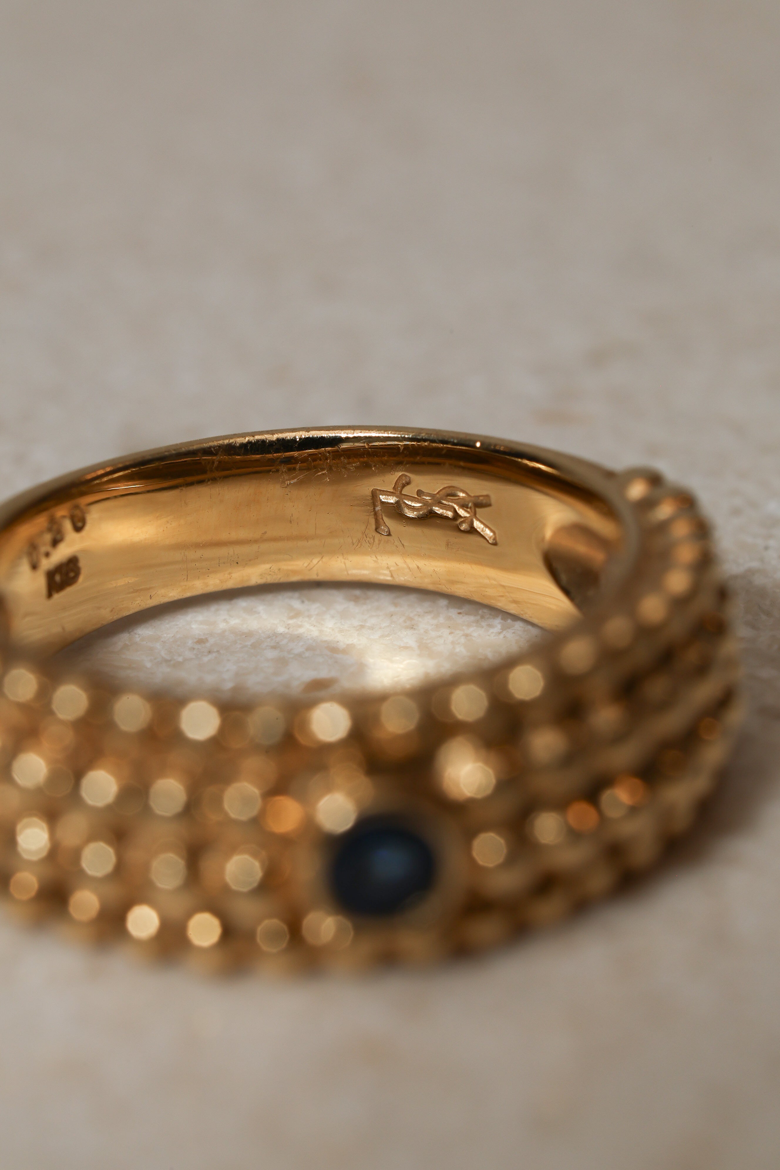 Architectural and alluring, this Saint Laurent four-row milgrain ring reinterprets the house’s iconic tension between structure and sensuality. Crafted in 18K yellow gold and crowned with a brilliant blue sapphire, its refined texture echoes YSL’s signature play of precision and rebellion.