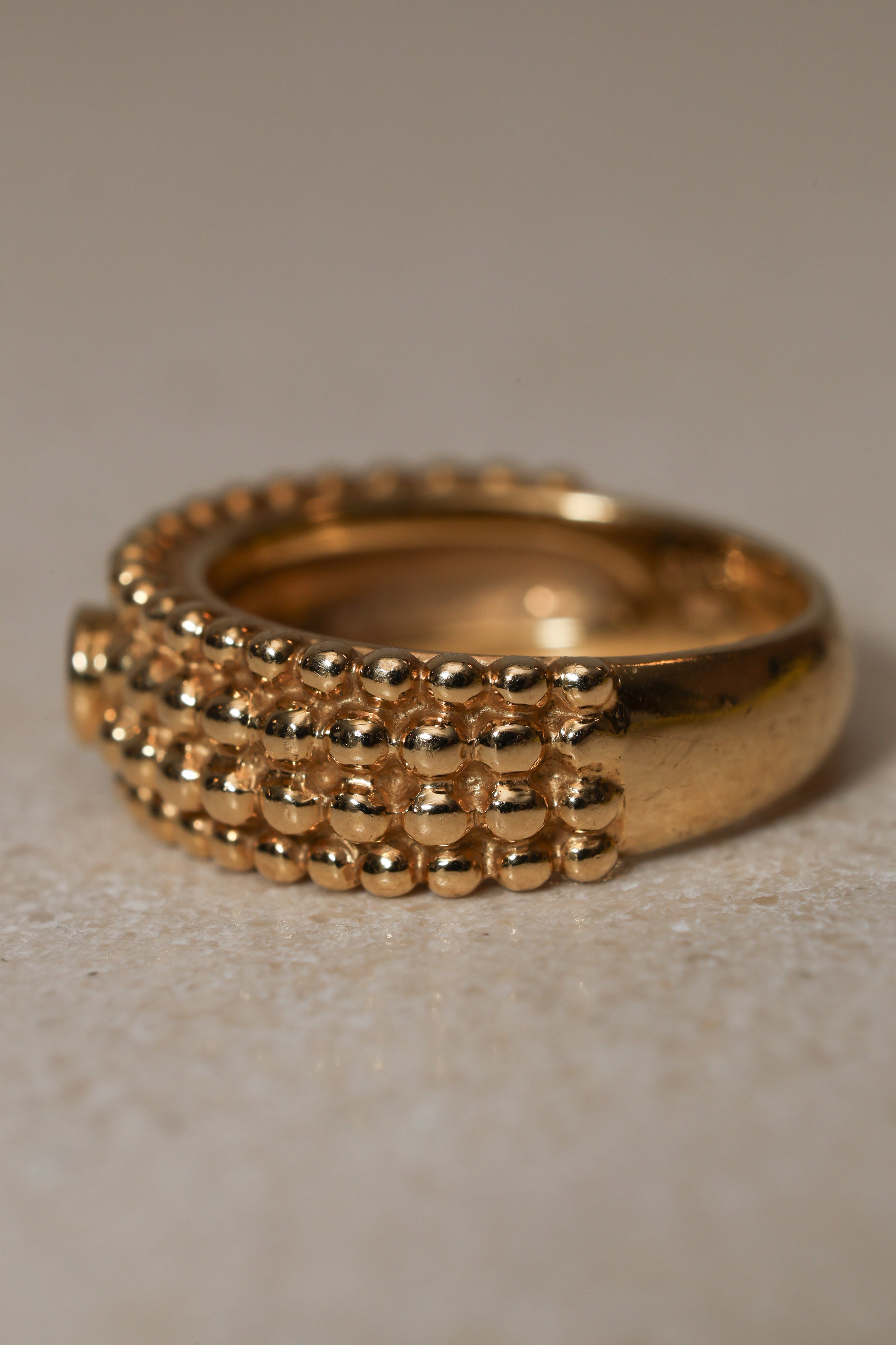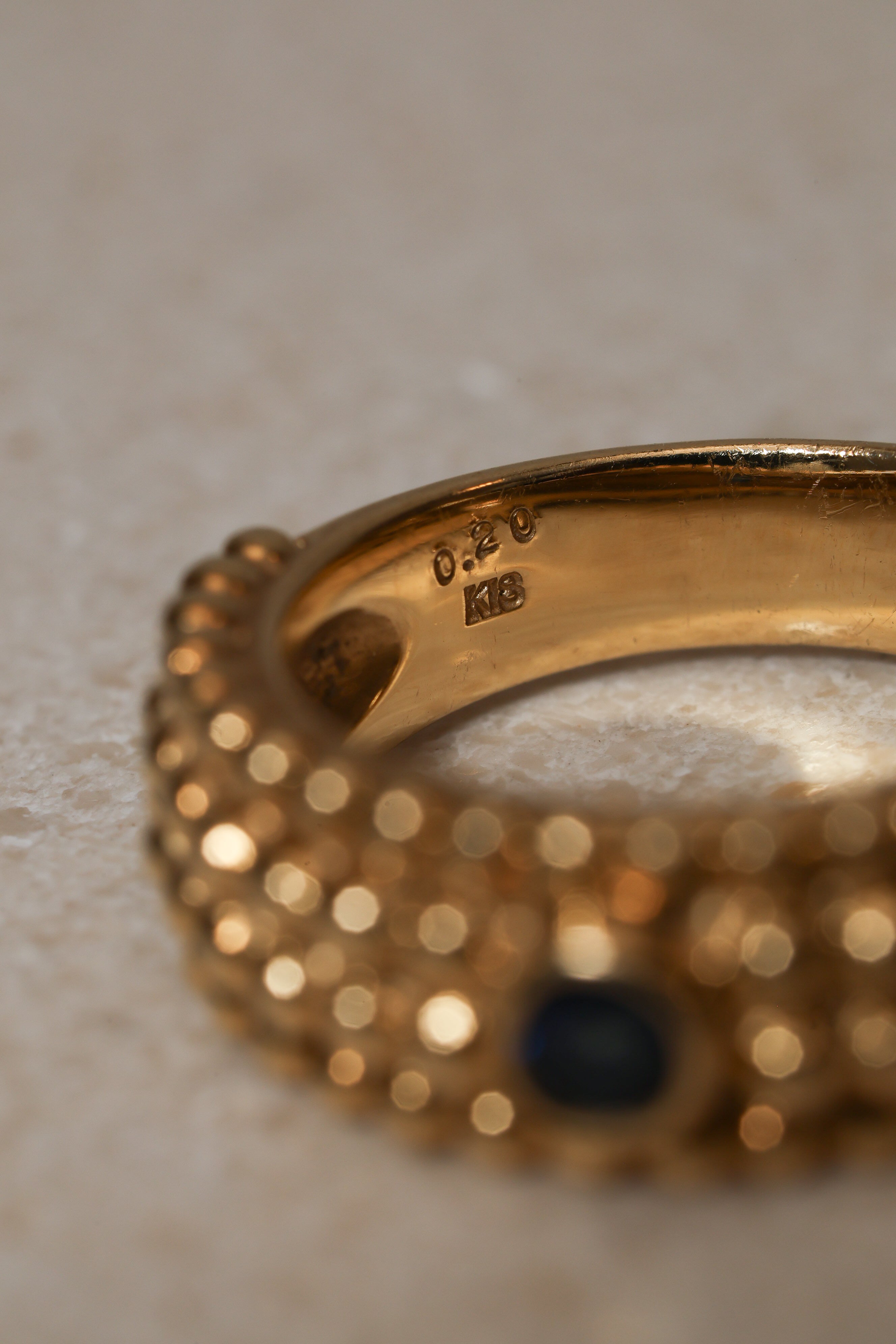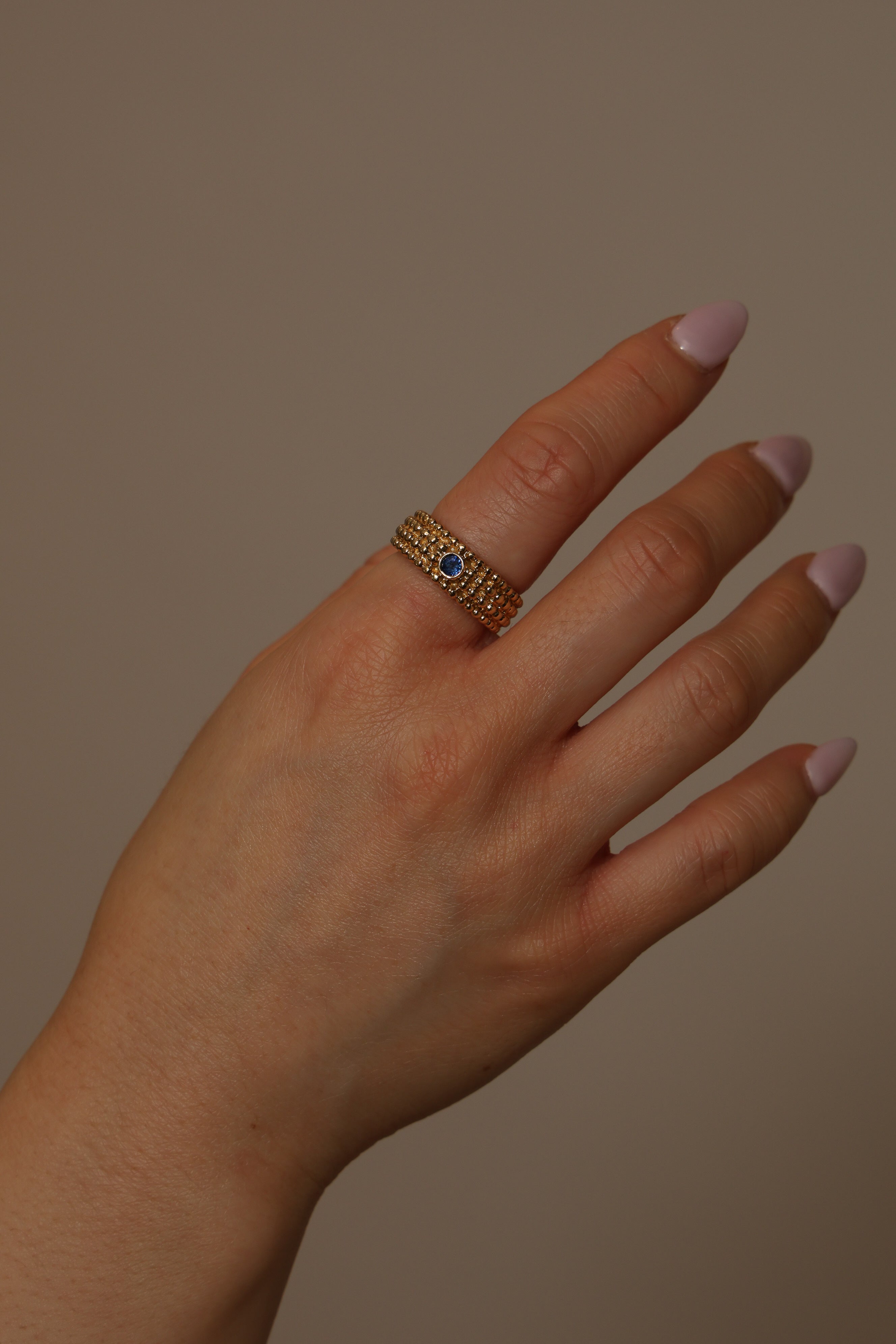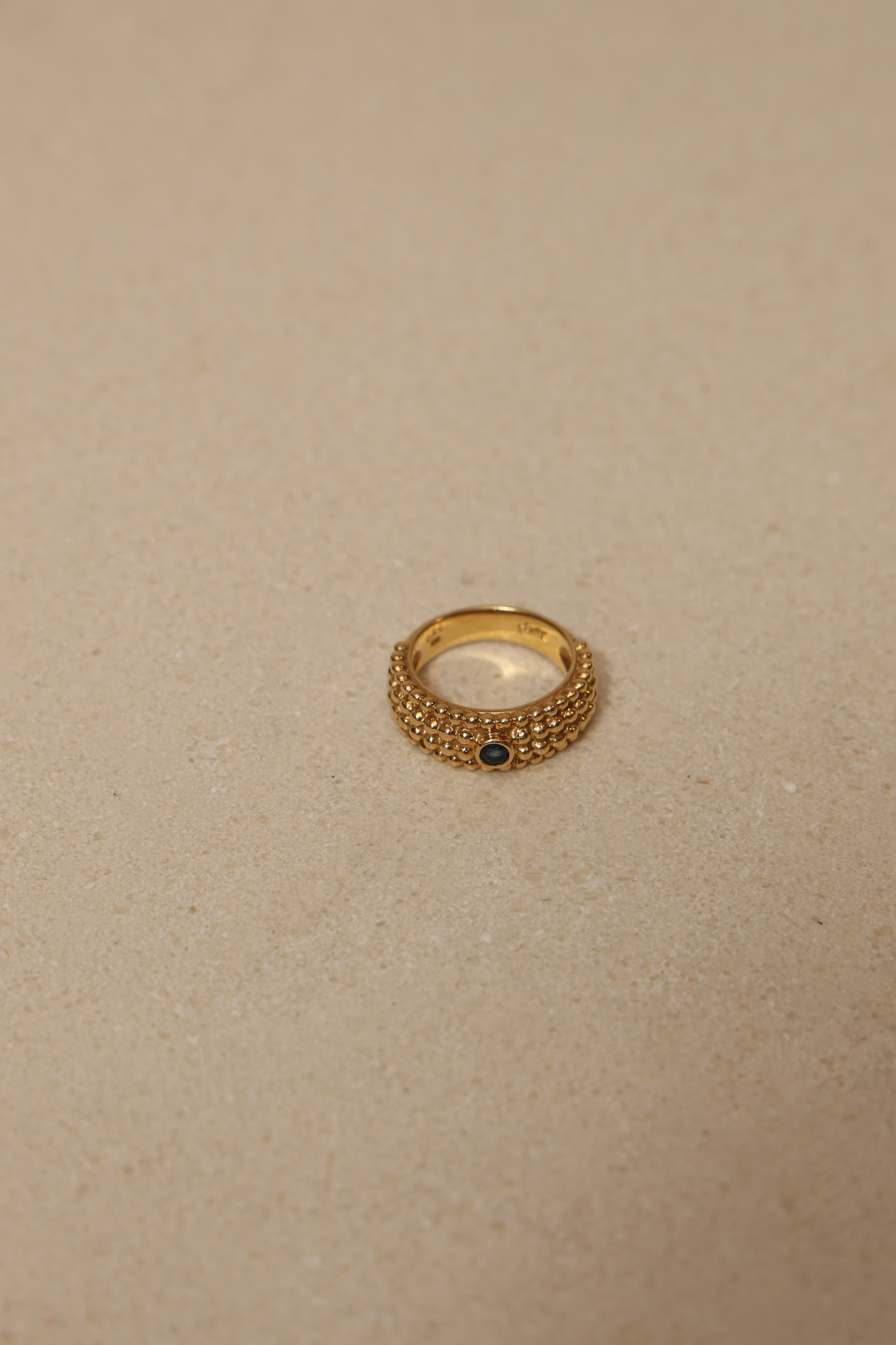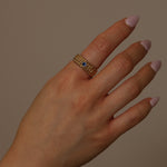 Architectural and alluring, this Saint Laurent four-row milgrain ring reinterprets the house’s iconic tension between structure and sensuality. Crafted in 18K yellow gold and crowned with a brilliant blue sapphire, its refined texture echoes YSL’s signature play of precision and rebellion.