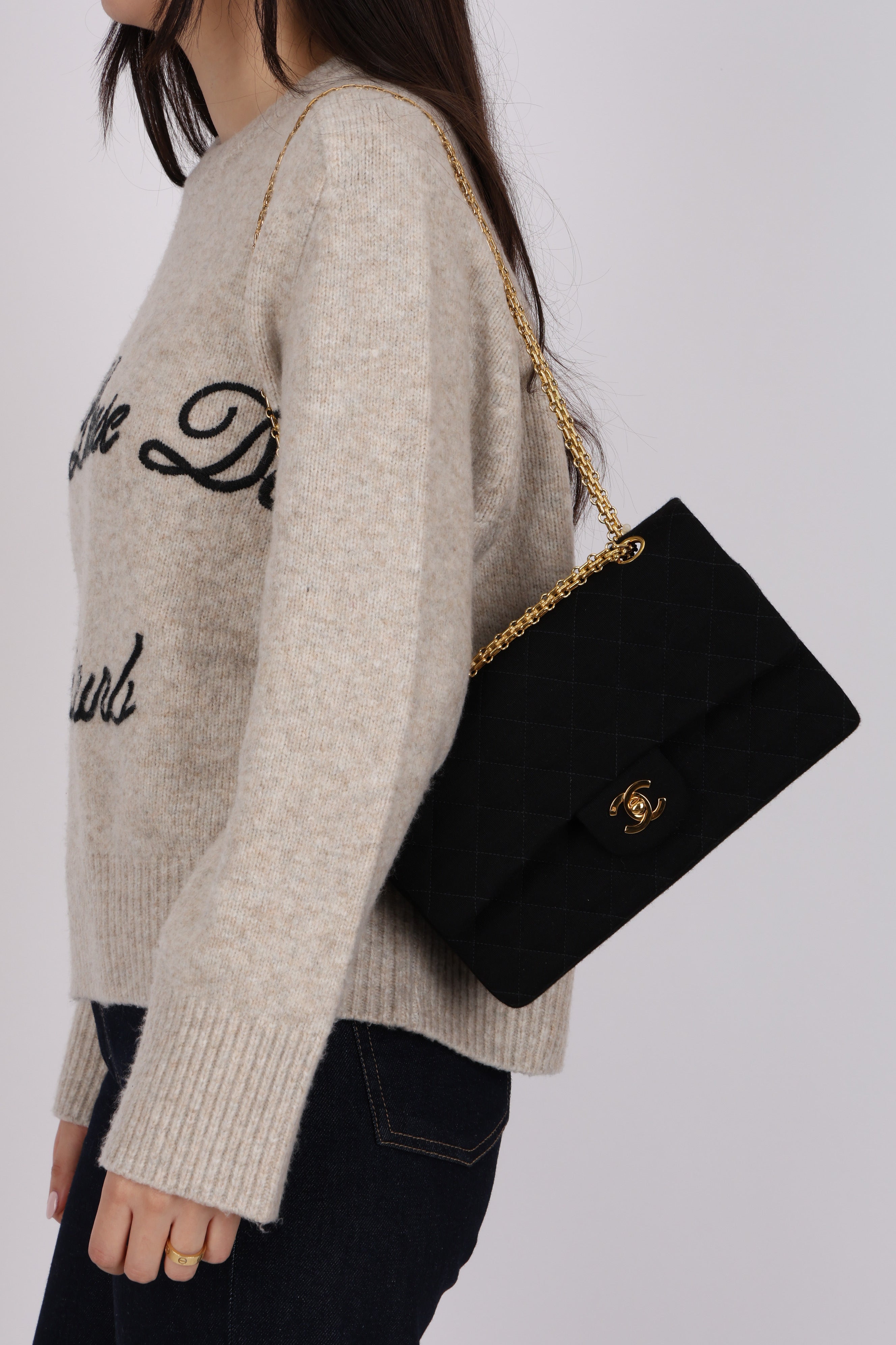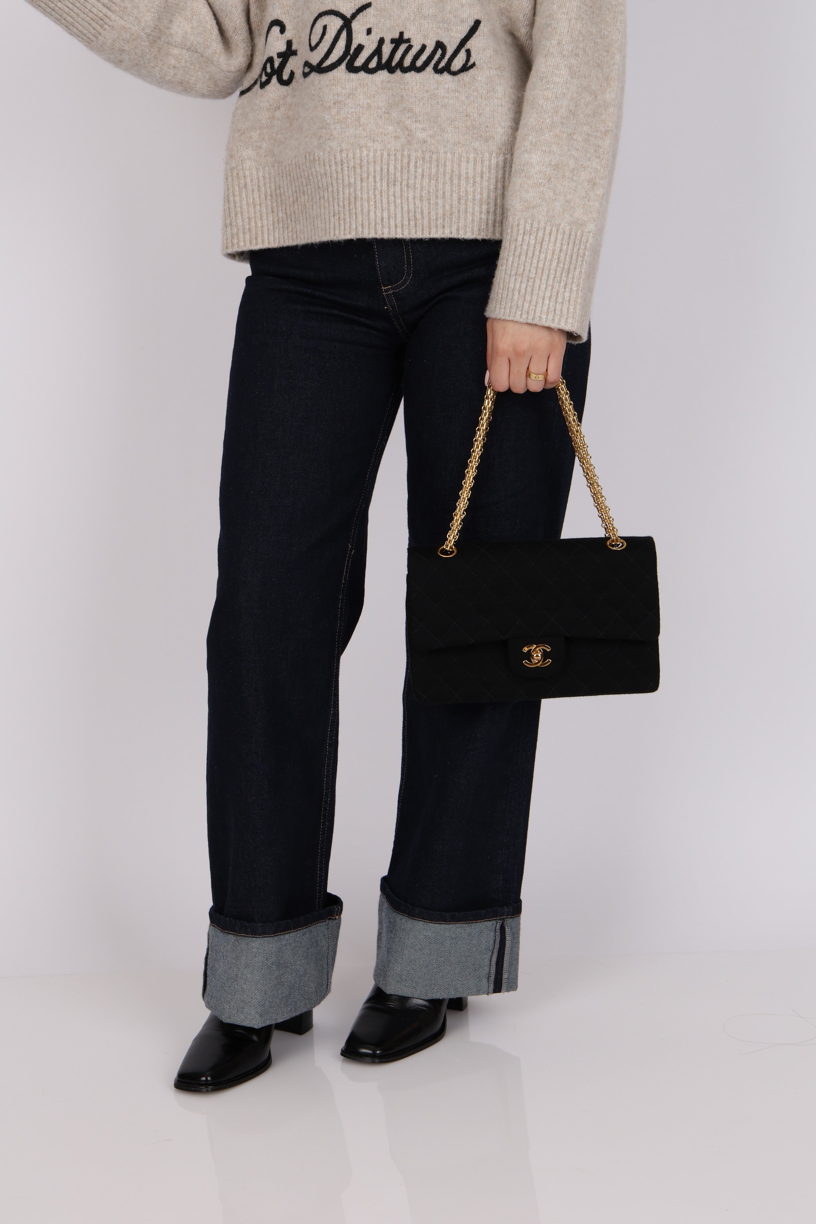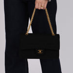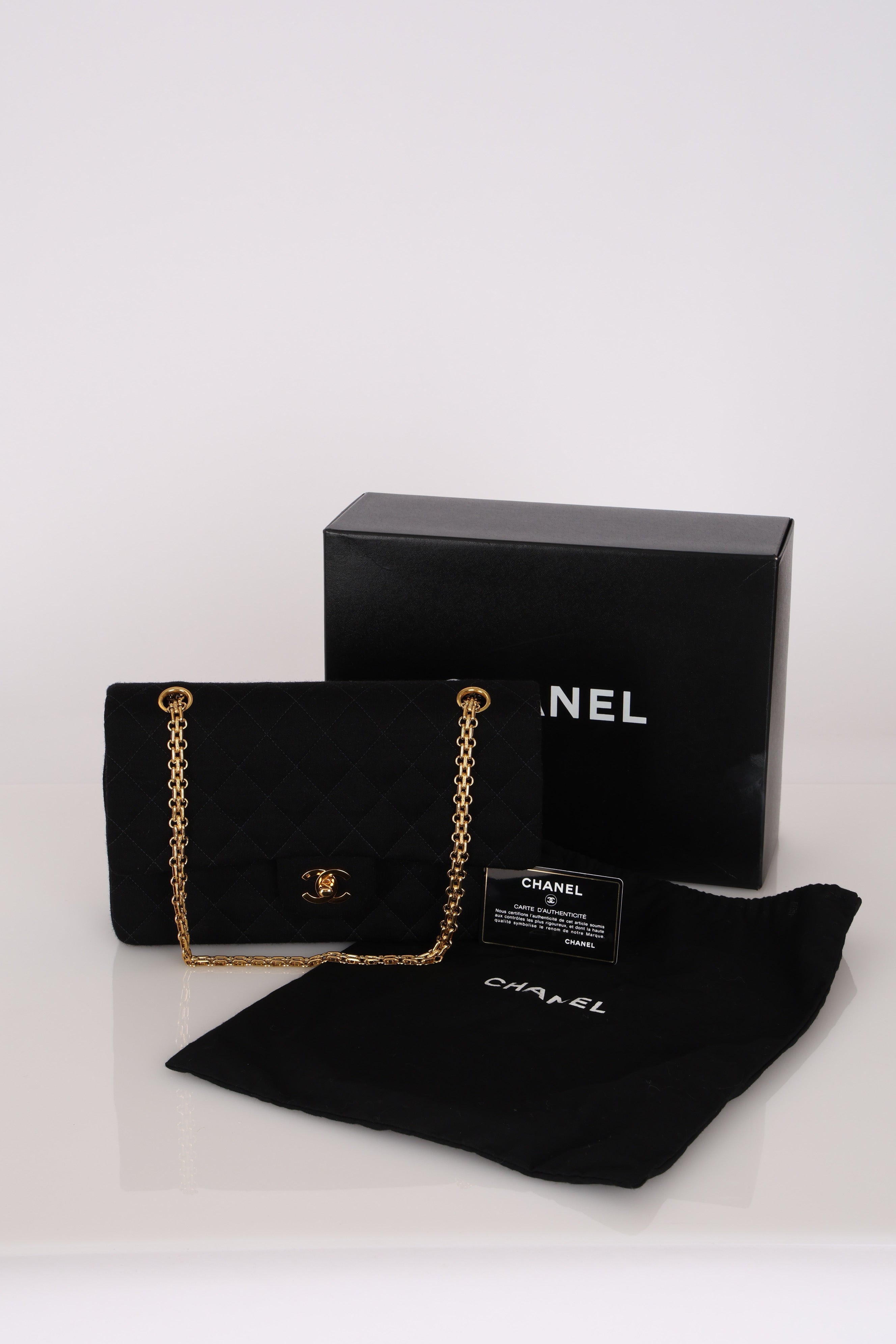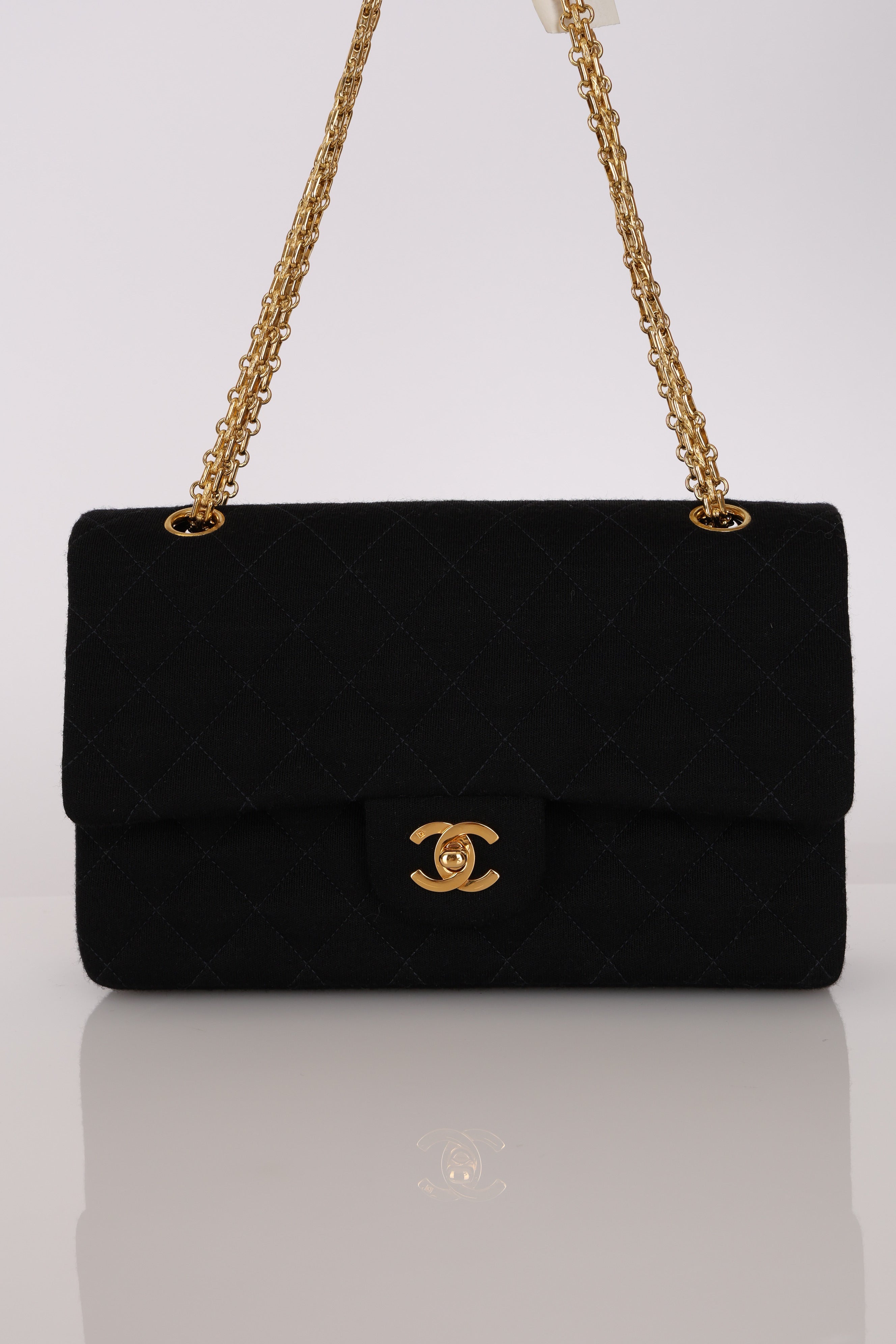 Don't miss your chance to snag this Chanel Jersey Double Flap Bag! Quilted in practical and playful black jersey with an equestrian-inspired chain, this bag is perfect for not only collectors but for everyday wear too!