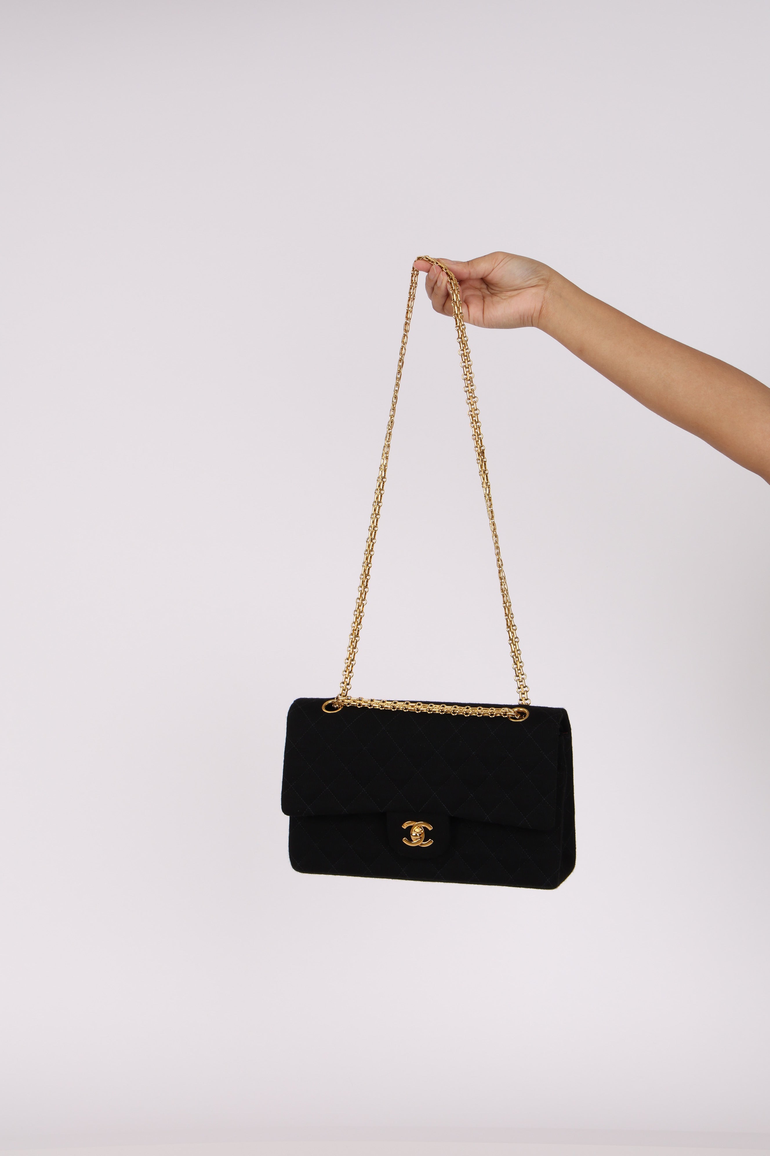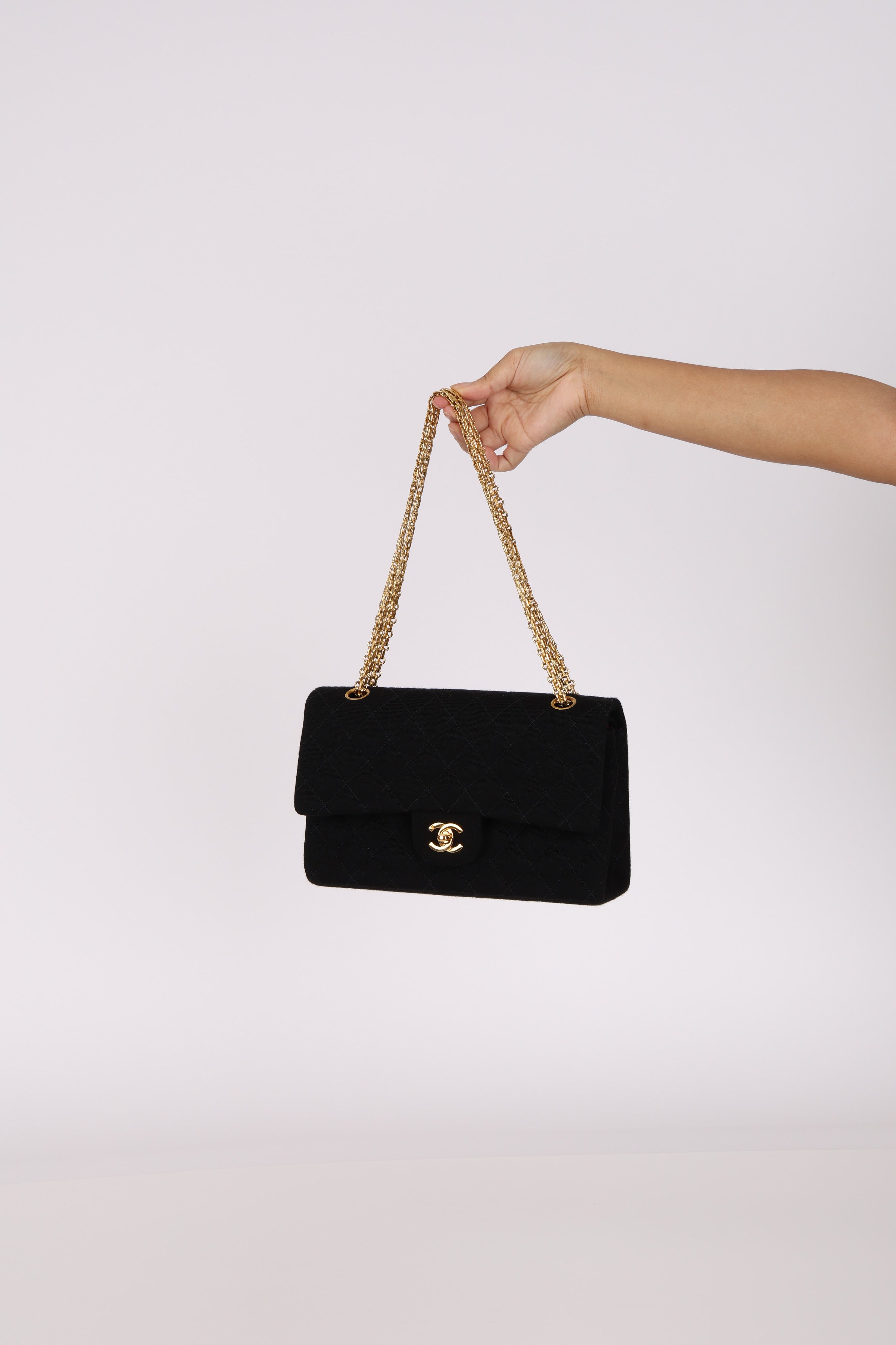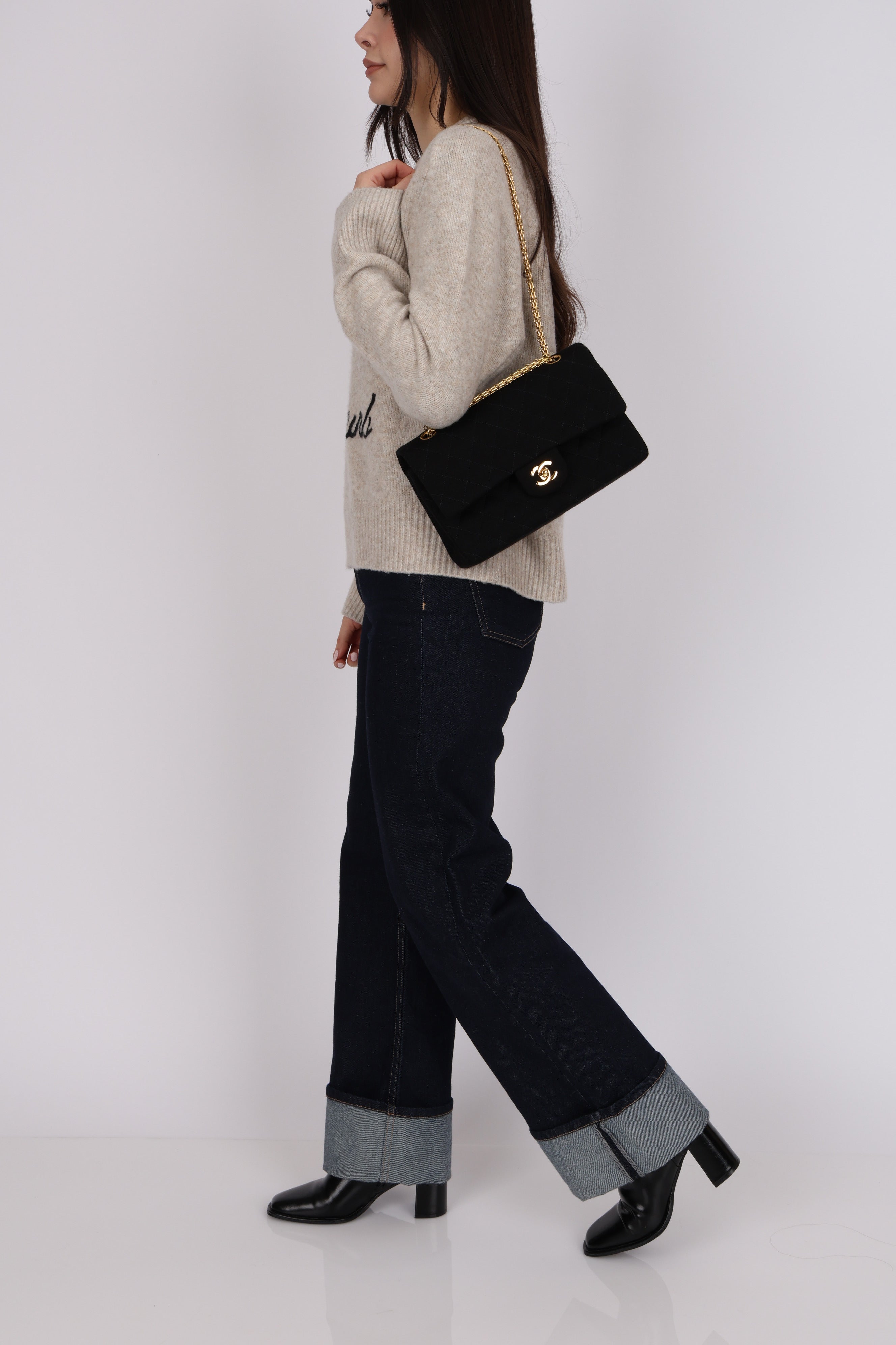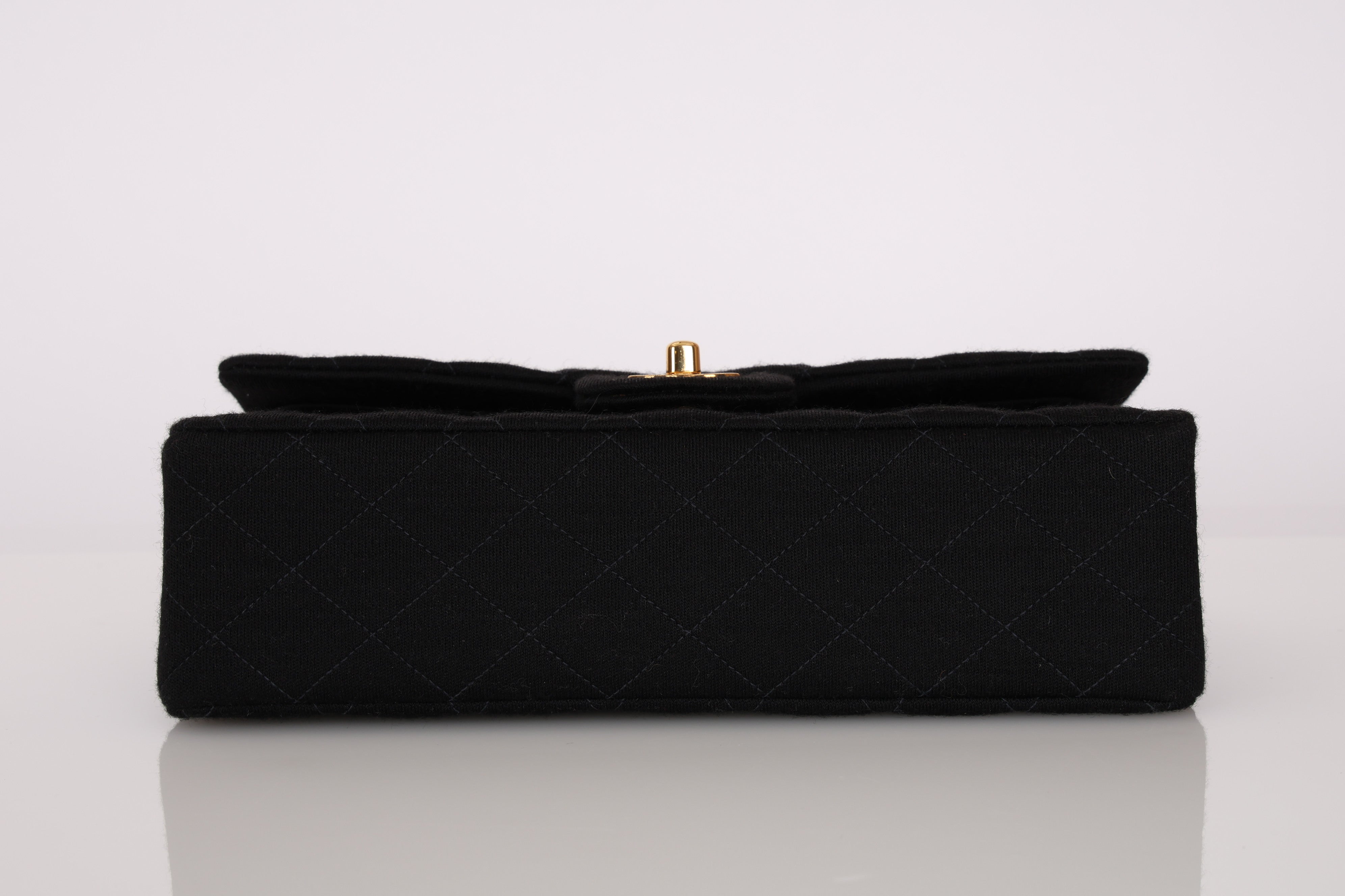 Don't miss your chance to snag this Chanel Jersey Double Flap Bag! Quilted in practical and playful black jersey with an equestrian-inspired chain, this bag is perfect for not only collectors but for everyday wear too!