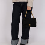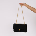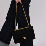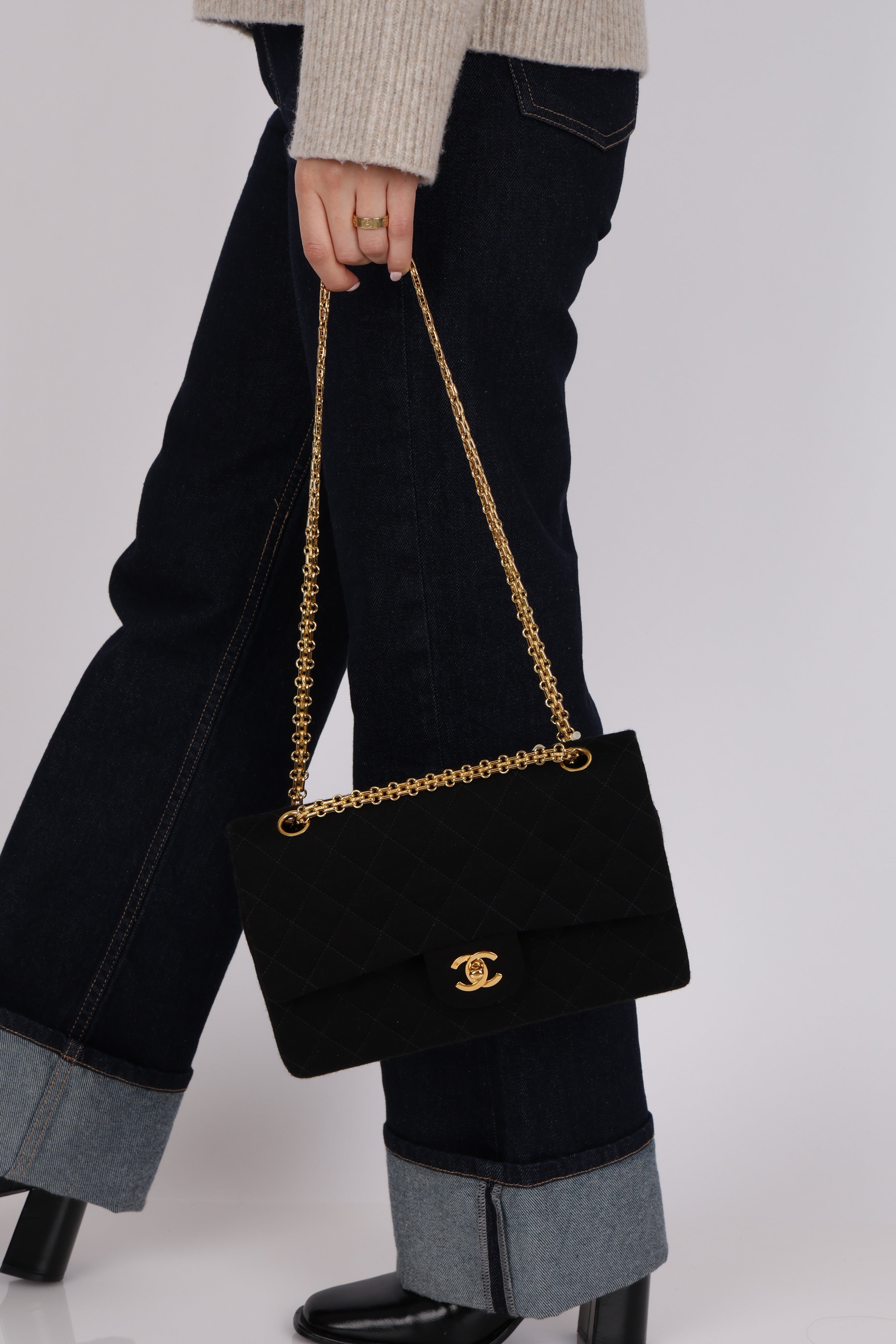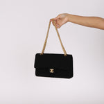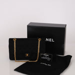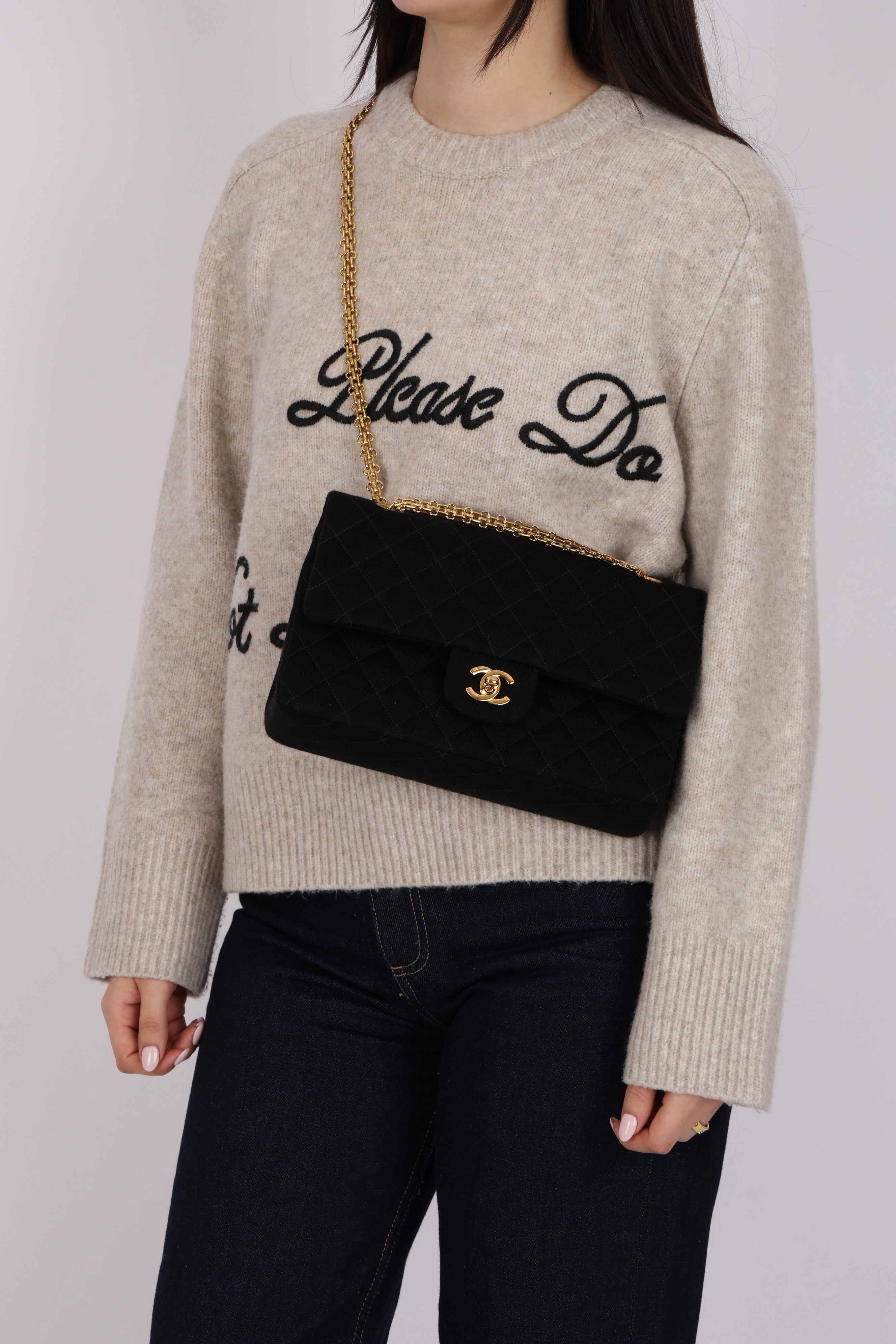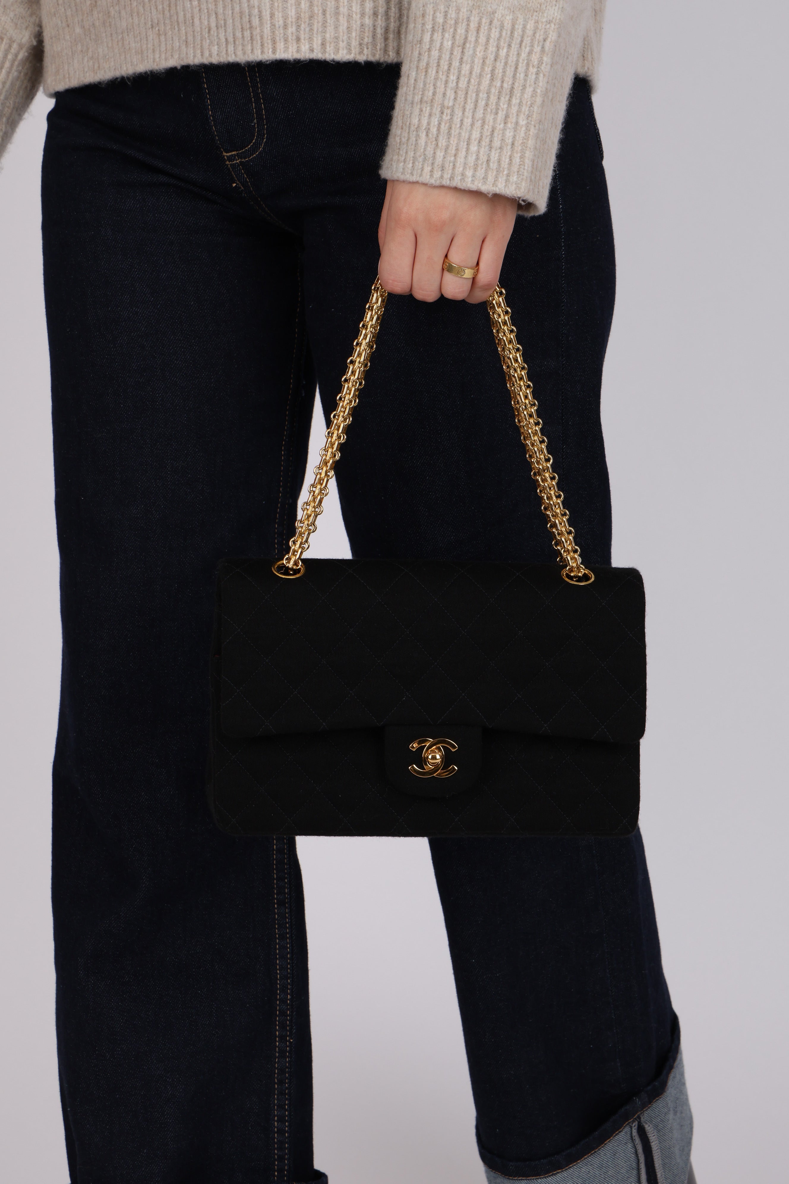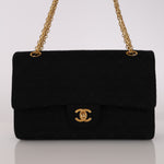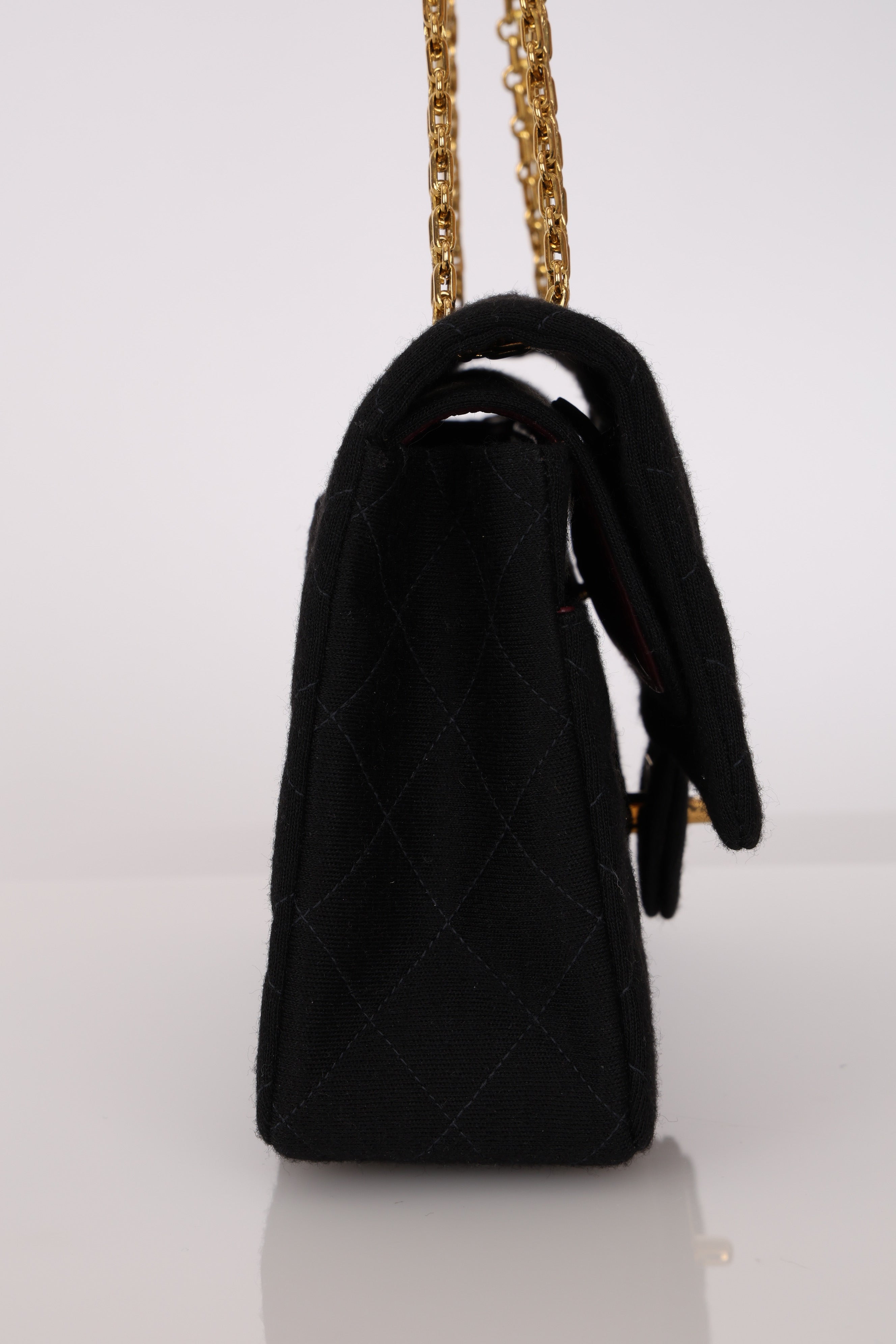 Don't miss your chance to snag this Chanel Jersey Double Flap Bag! Quilted in practical and playful black jersey with an equestrian-inspired chain, this bag is perfect for not only collectors but for everyday wear too!